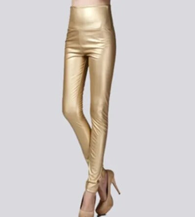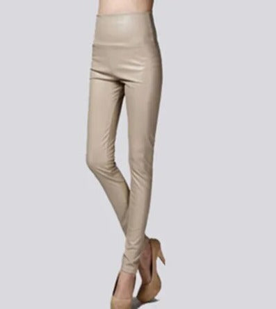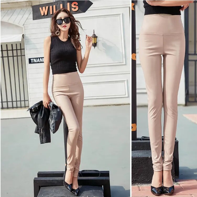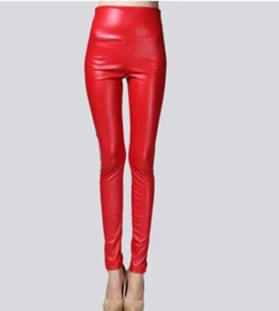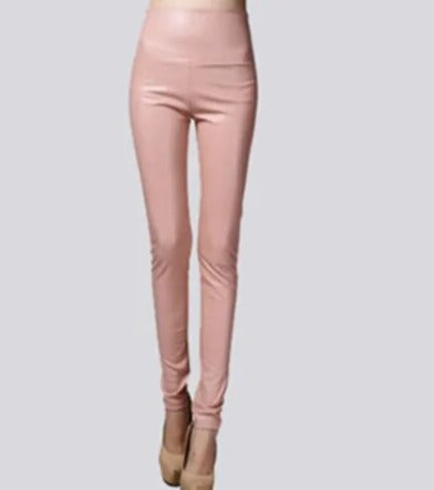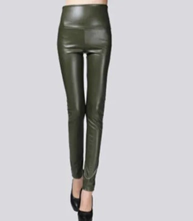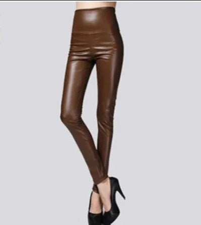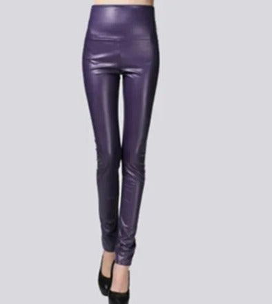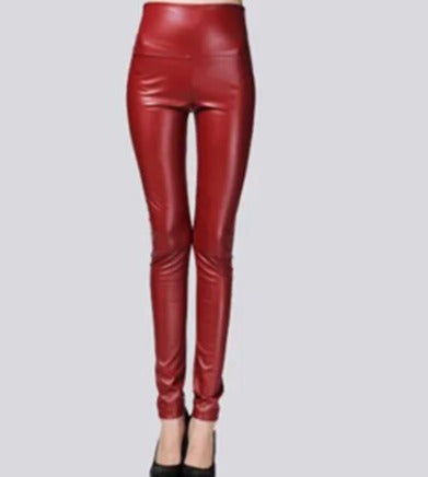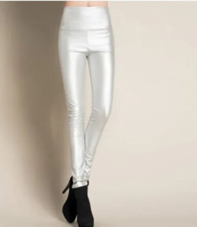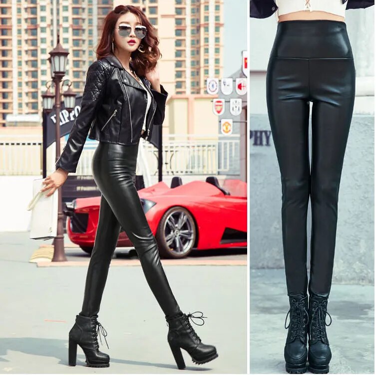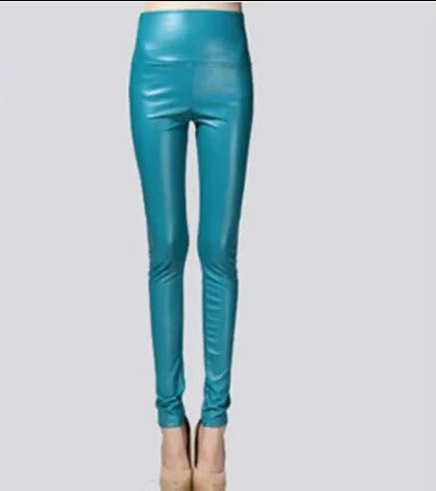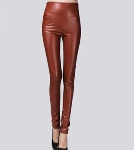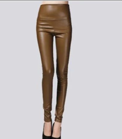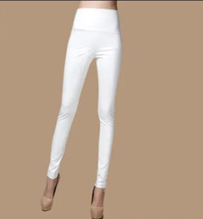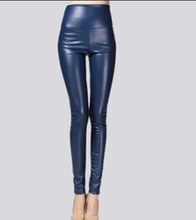 Stay comfortable and stylish with our slim fit PU leggings. Crafted from a stretchy PU fabric for a close-cut, slim fit that contours the body for a flattering silhouette. The wide waistband ensures a secure fit.