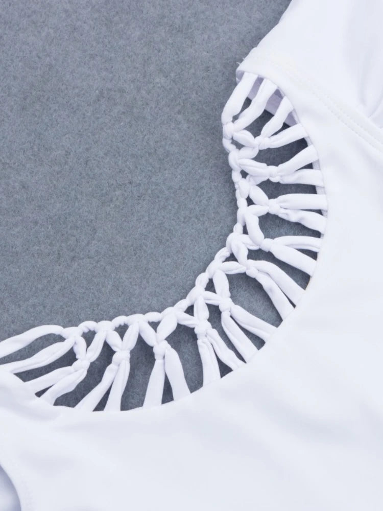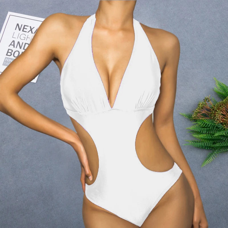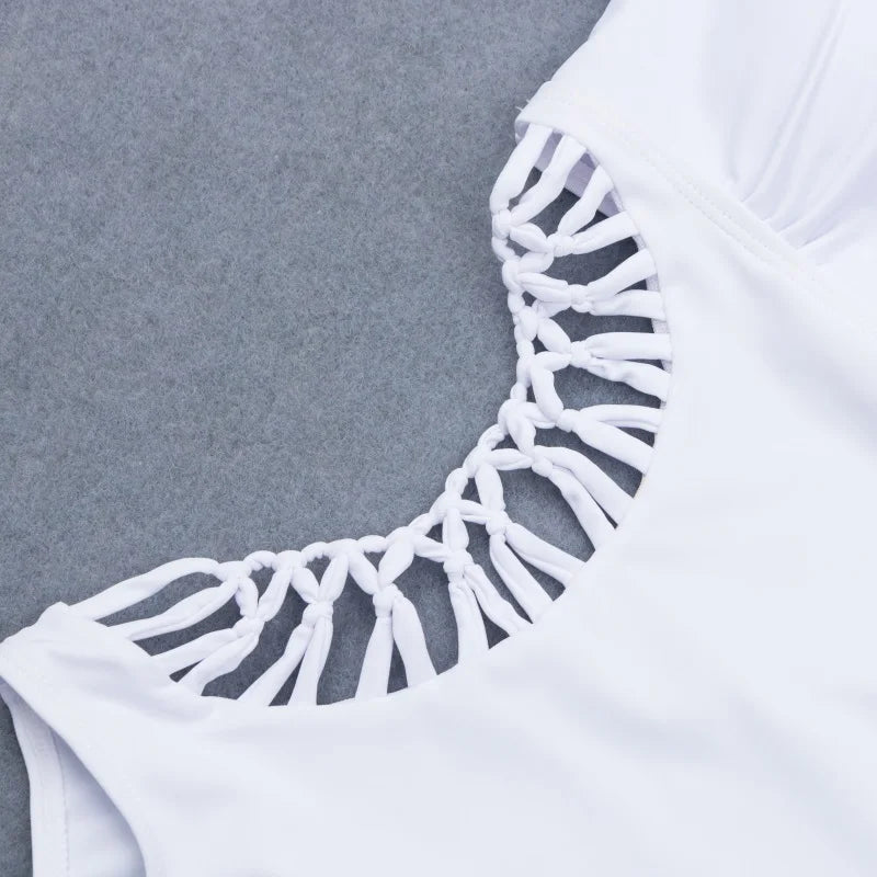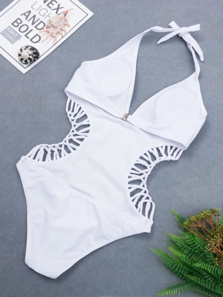 Introducing the ultimate swimwear for the bold and confident woman - the Sexy White Halter Cut Out Bandage Swimsuit.