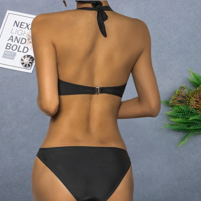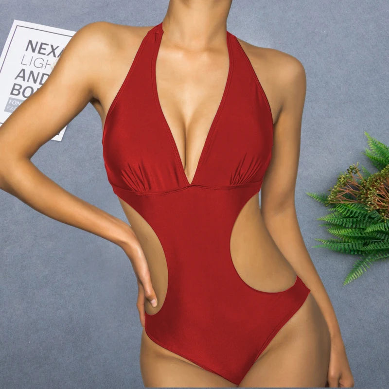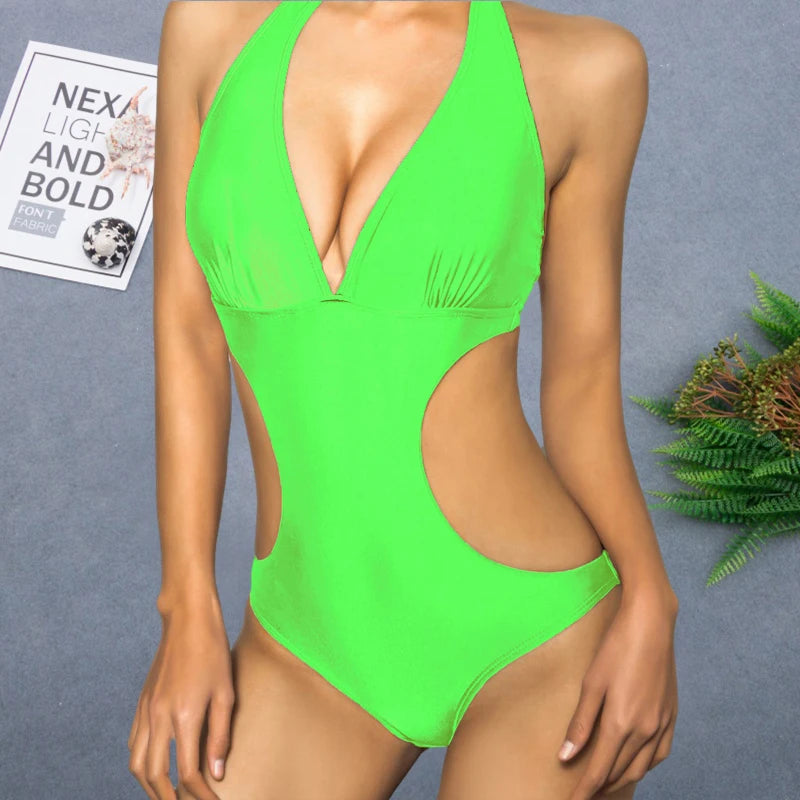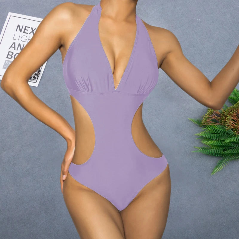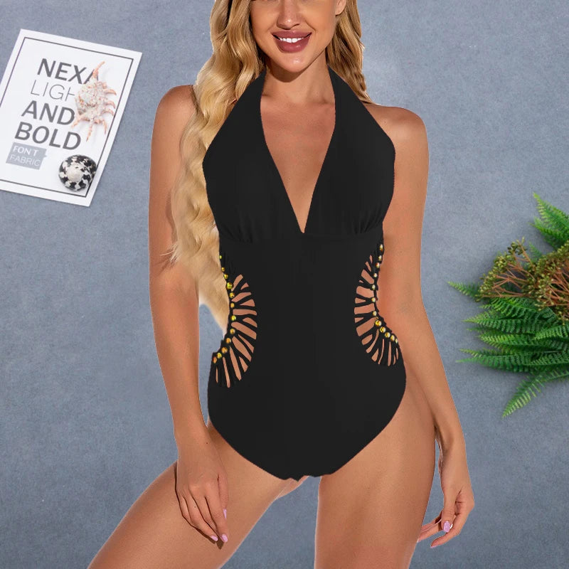 This one-piece swimsuit is designed to make a statement with its unique cut-out details and figure-hugging bandage material. Made with a blend of high-quality polyester and spandex, this swimsuit offers both comfort and durability. The halter neck adds a touch of elegance while the push-up feature enhances your curves for a flattering fit.