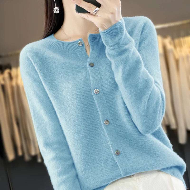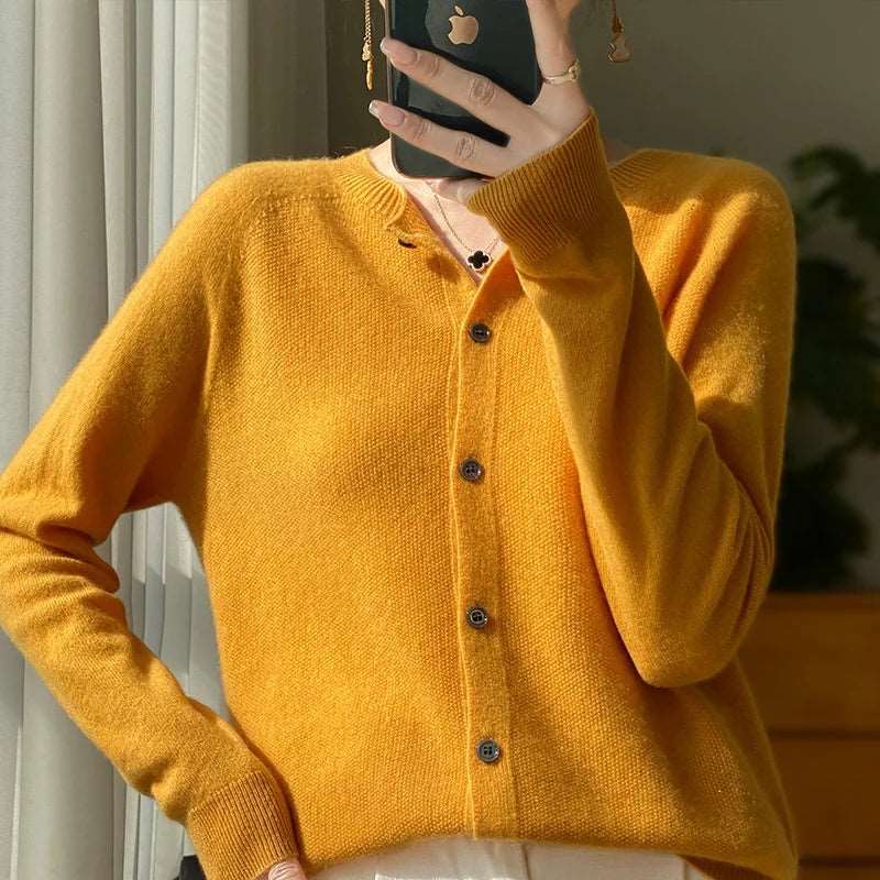 Introducing the O-neck front buttons cardigan sweater, crafted from 100% Merino wool for a luxurious and elegant look. This sweater is a must-have for any fashion-forward woman, with its classic O-neck design and front button closure. The slight stretch in the fabric ensures a comfortable and flattering fit, while the regular sleeve style adds a touch of sophistication. The material composition of wool makes this sweater soft, warm, and perfect for cooler weather. The solid pattern adds a timeless appeal to this piece, making it a versatile addition to any wardrobe. Elevate your style with this new spring essential from IMKOLOR.