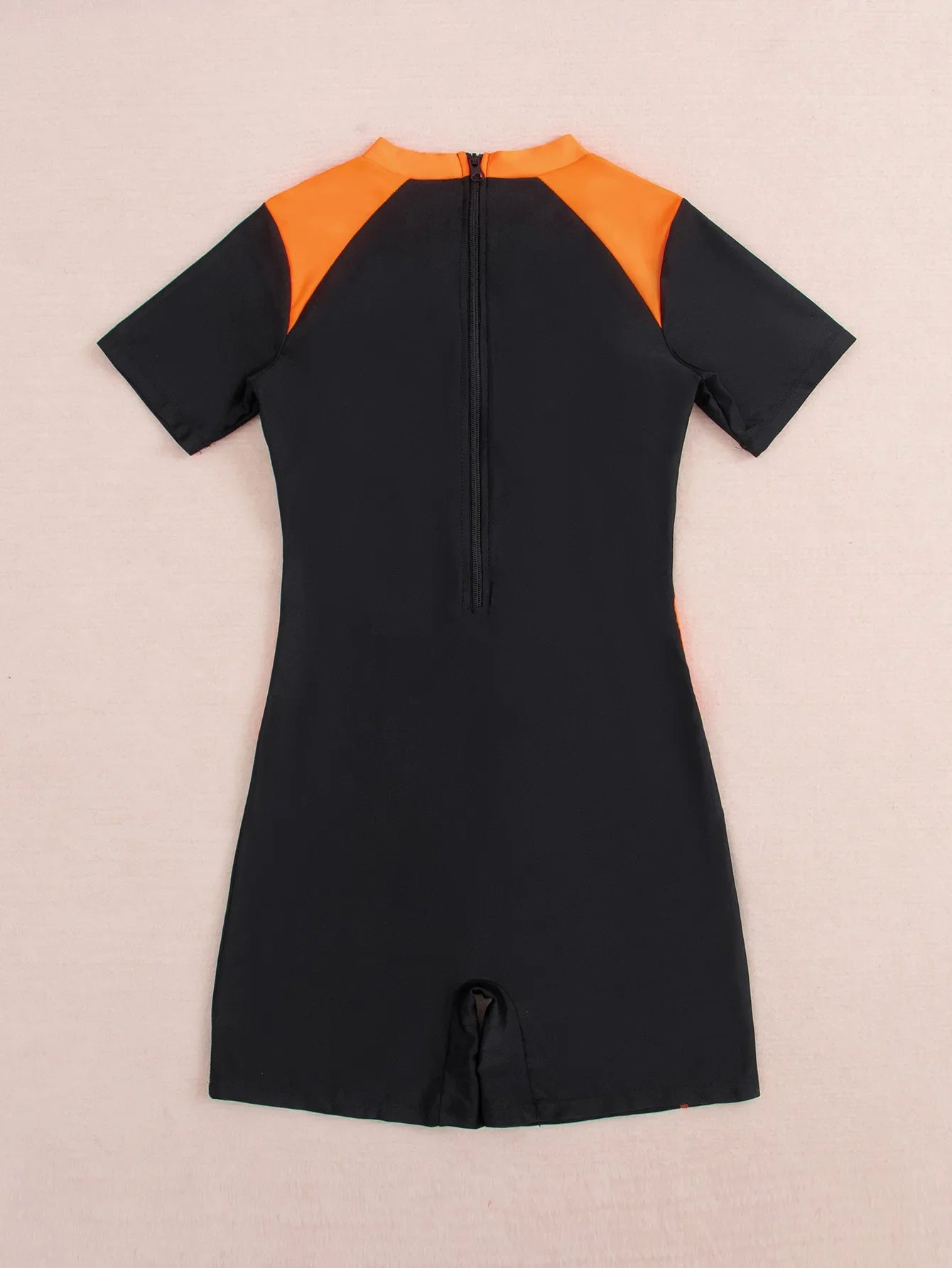 Zipper surfing style One Piece Short Sleeve Swimwear