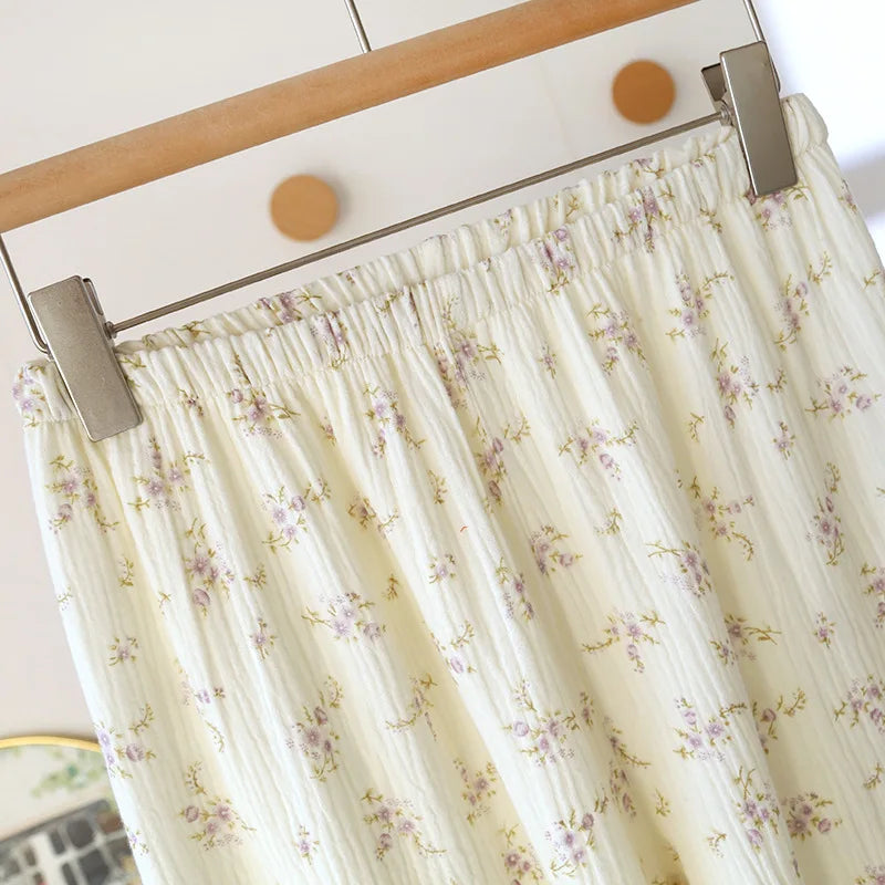 Introducing our versatile and stylish Cotton Long Sleeved Flower Print Crepe Pyjama Set, perfect for the spring and autumn seasons. Made with high-quality cotton material, this set is both comfortable and durable, ensuring a good night's sleep. The set includes a long-sleeved top with a collar and a pair of pants, both featuring a beautiful flower print on soft crepe fabric.