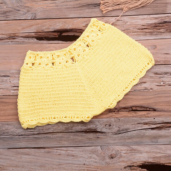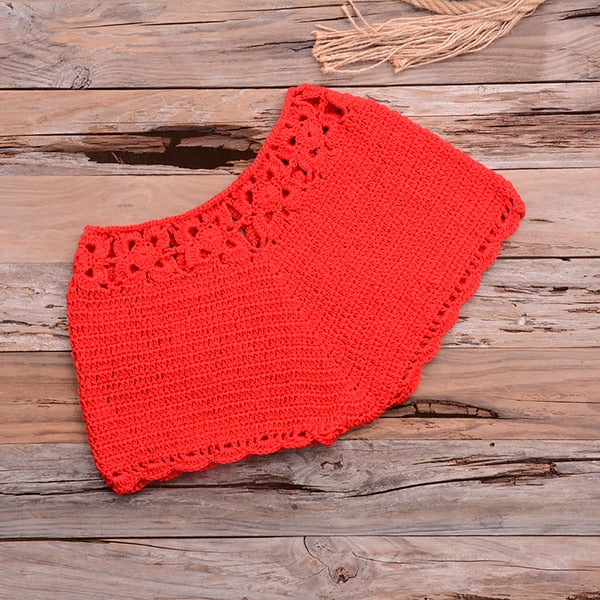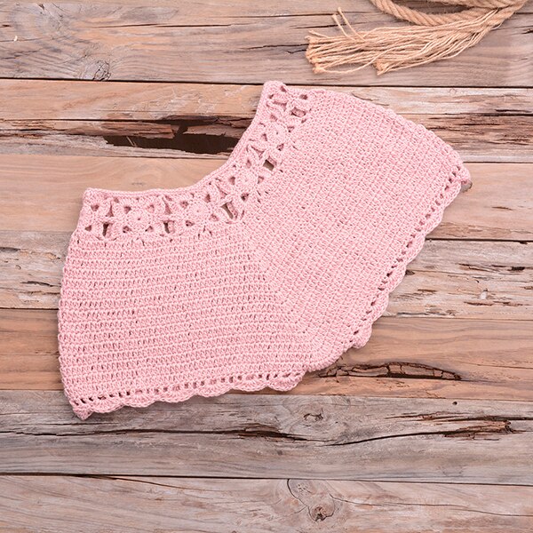 This set includes a crochet bikini top and bottom. Bikini top is a halter style with crochet trim and body detail. Bikini bottom is a high-waisted shorts. Bottom is designed to provide full coverage. Top provides full coverage with a cute style. Set is designed to provide a comfortable and flattering fit.