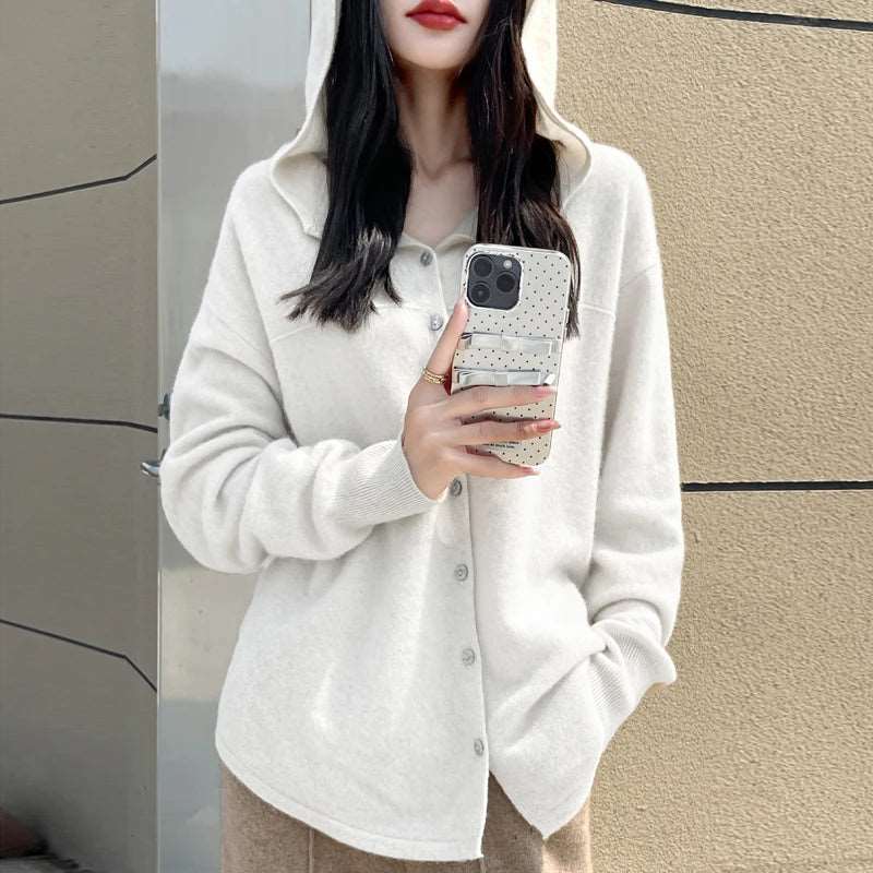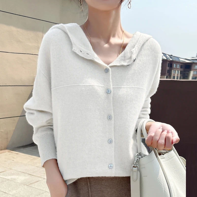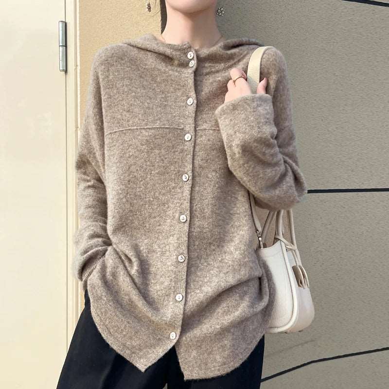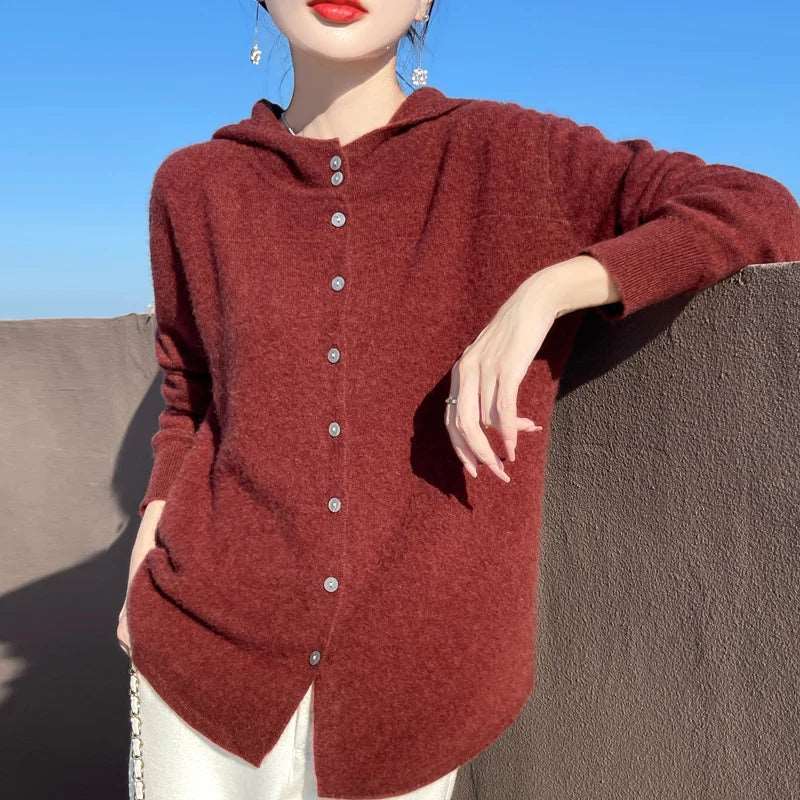 This cardigan is not only stylish but also cosy and comfortable. The hooded collar adds a touch of fashion-forwardness, while the loose fit allows for comfortable movement. With a slight stretch, this cardigan is perfect for layering over any outfit. The solid colour and fine yarn make it a versatile piece that can be dressed up or down. Crafted with 95% or more wool, this cardigan is of the highest quality and will keep you warm all season long. Upgrade your wardrobe with this must-have piece from IMKOLOR.