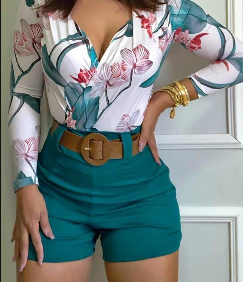 Floral Print Long Sleeve V Neck Top & Shorts Set