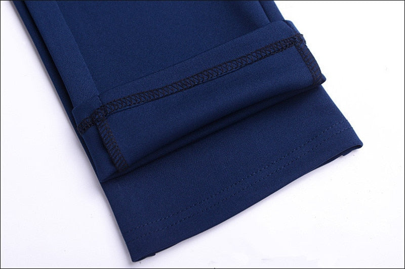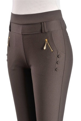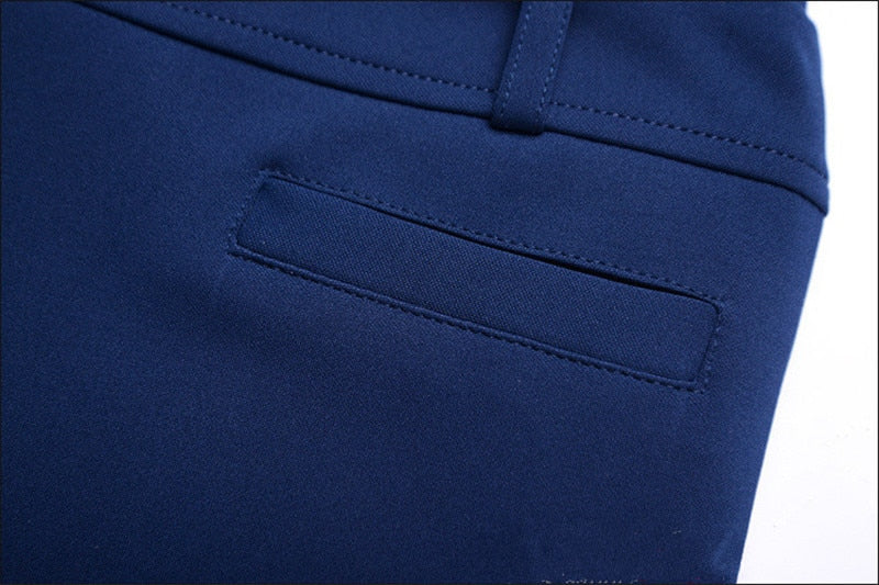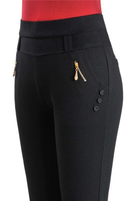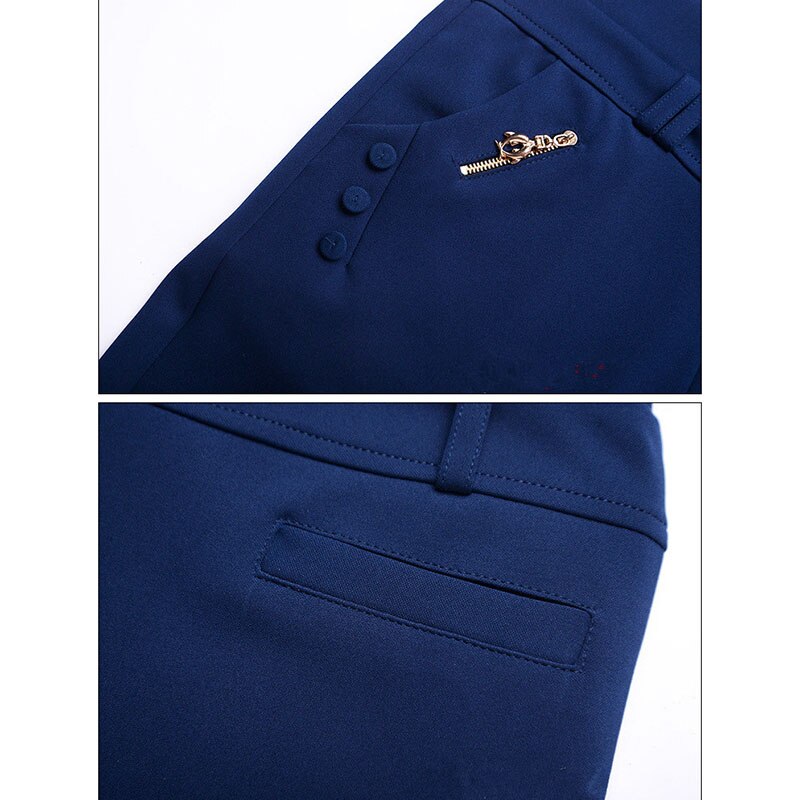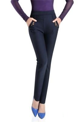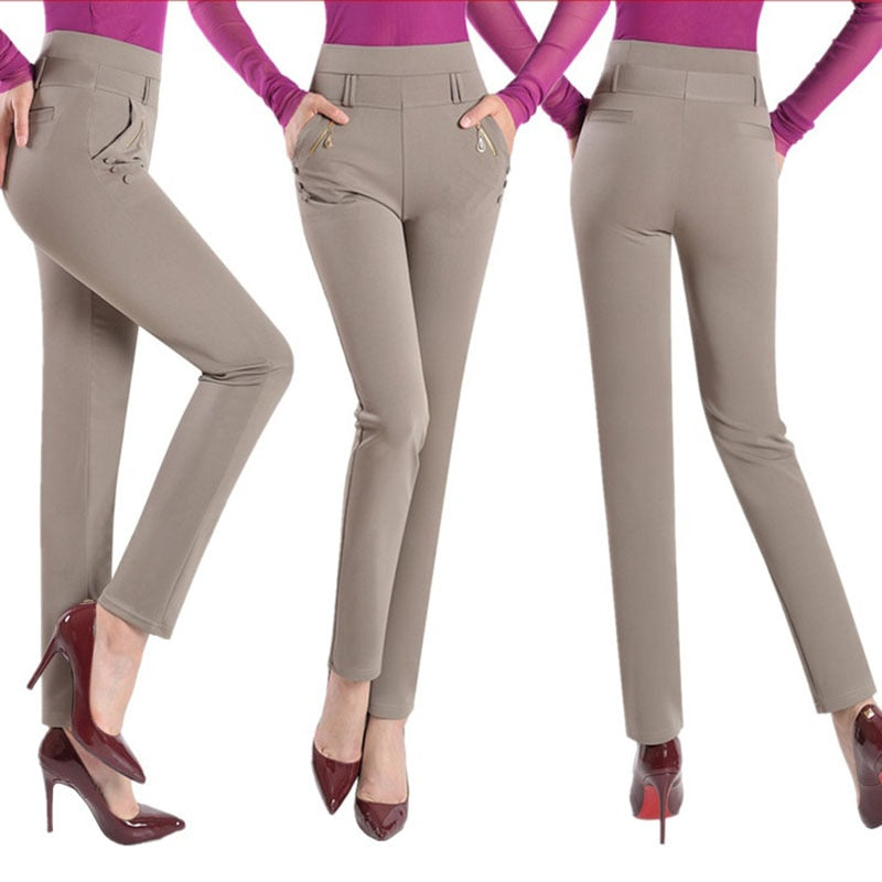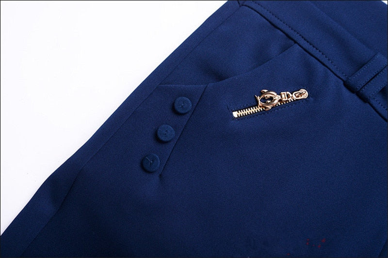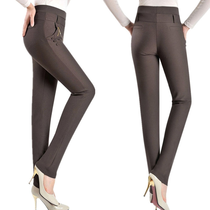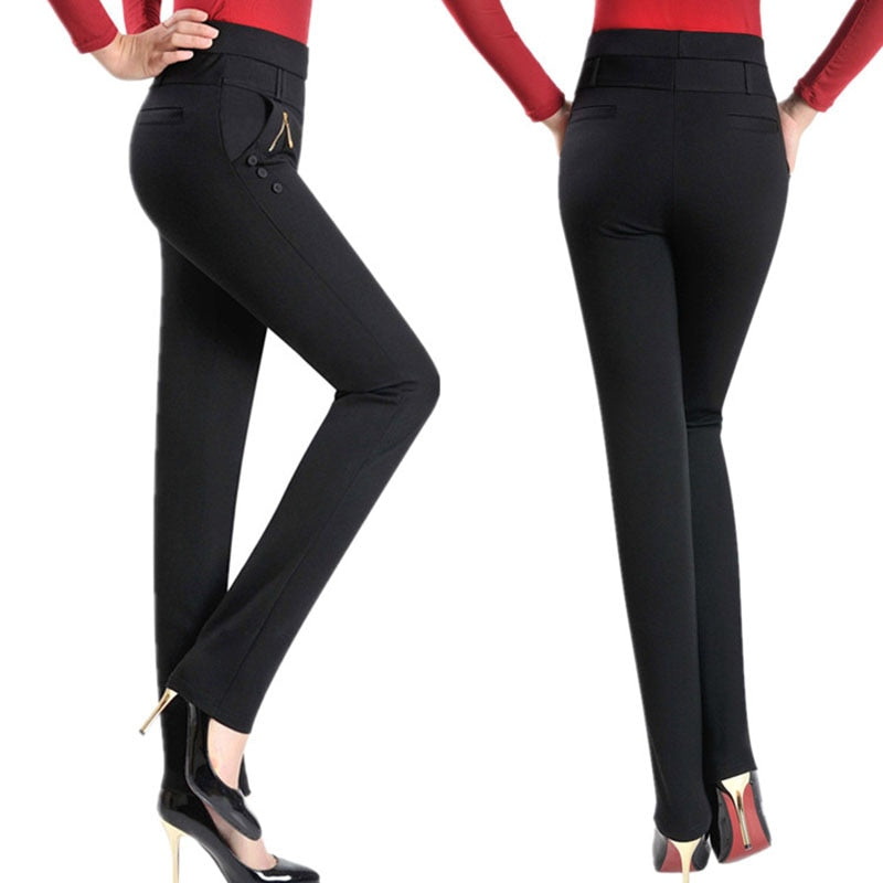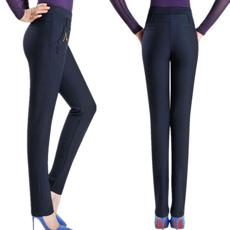 Perfect for a day at the office or a night out on the town, these trousers are a wardrobe staple. They are made of a stretchy fabric that allows for a comfortable fit and they have a high waist to elongate the legs. They can be paired with a light weight top or turtleneck top in the winter.