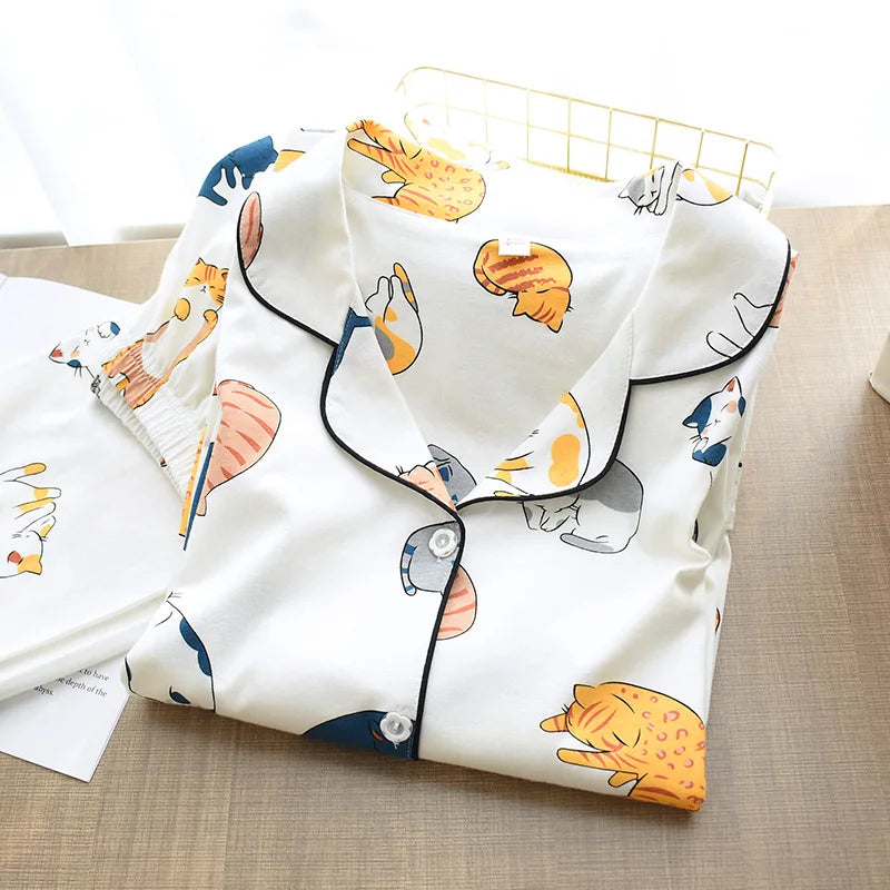 The set includes a long-sleeved top and trousers, both featuring a cute and stylish Japanese design. The material composition is 100% cotton, making it gentle on the skin and suitable for all seasons.