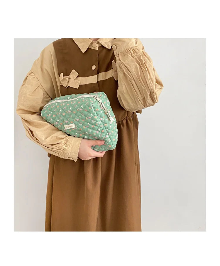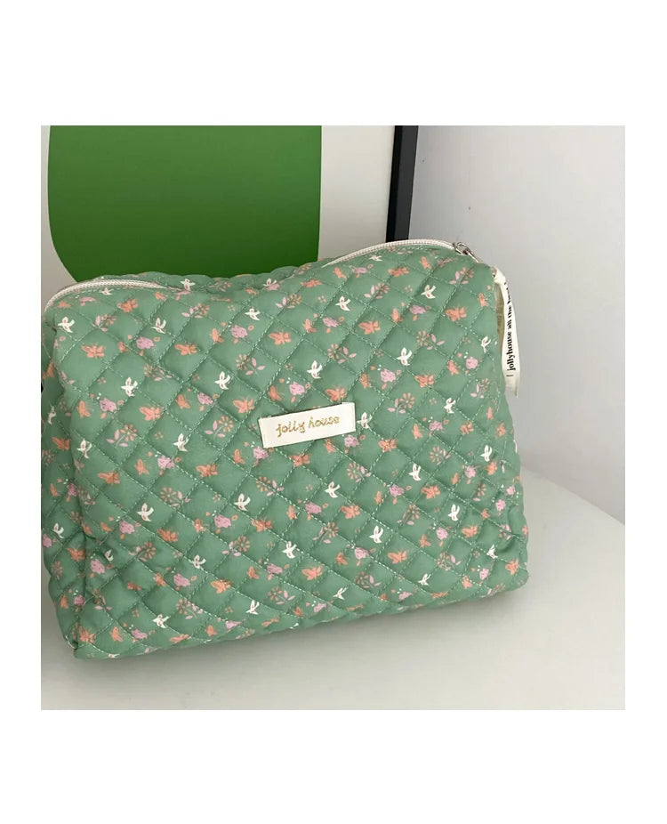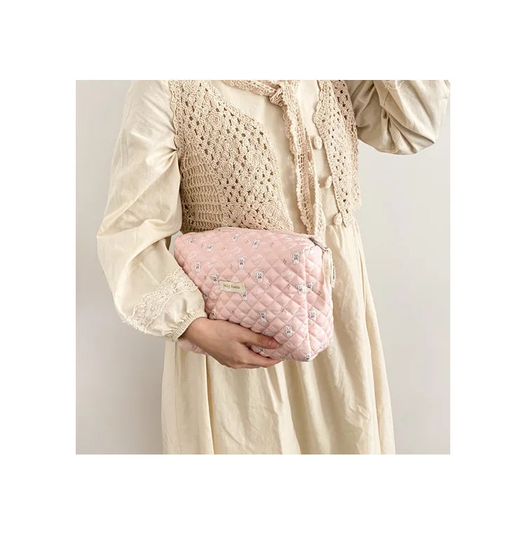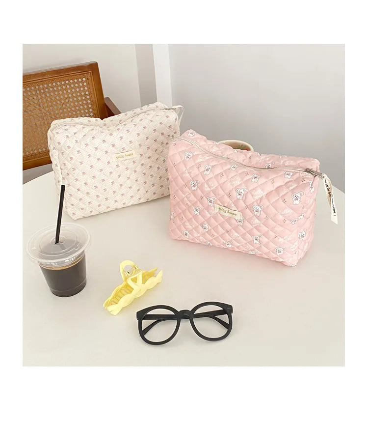 The bag features a convenient zipper closure, ensuring that your cosmetics stay secure and organized at all times. With its spacious interior, you can easily fit all your makeup essentials, making it the ideal travel companion. Upgrade your makeup game with the Quilted Soft Cotton Cosmetic Organizer bag.