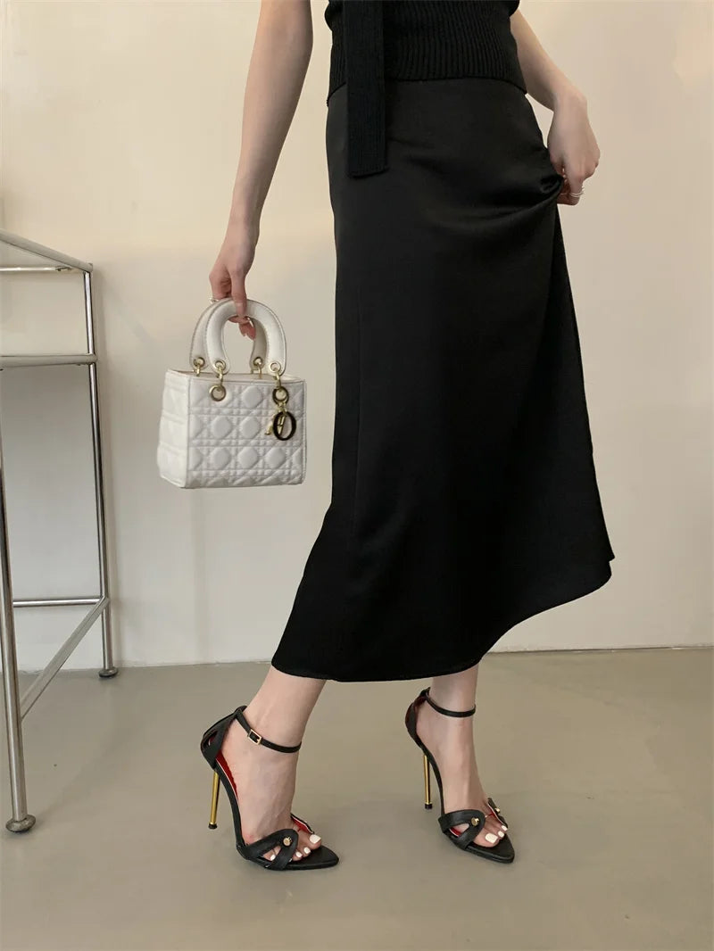 Elevate your style with these stunning high heel sandals. The pointed toe design adds a touch of sophistication, while the narrow band and ankle strap provide a secure and comfortable fit. The metal decoration on the band adds a unique and eye-catching detail to these already glamorous shoes.