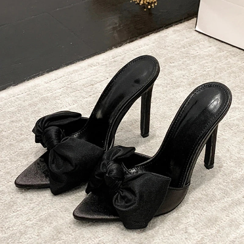 The thin heels add a touch of femininity and the butterfly-knot fashion element adds a unique and stylish touch to these slippers. These mules are a must-have for any fashion-forward individual.