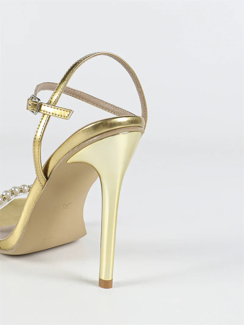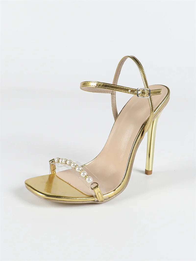 Square Toe 11.5cm faux Pearl Chain High Heel Sandals