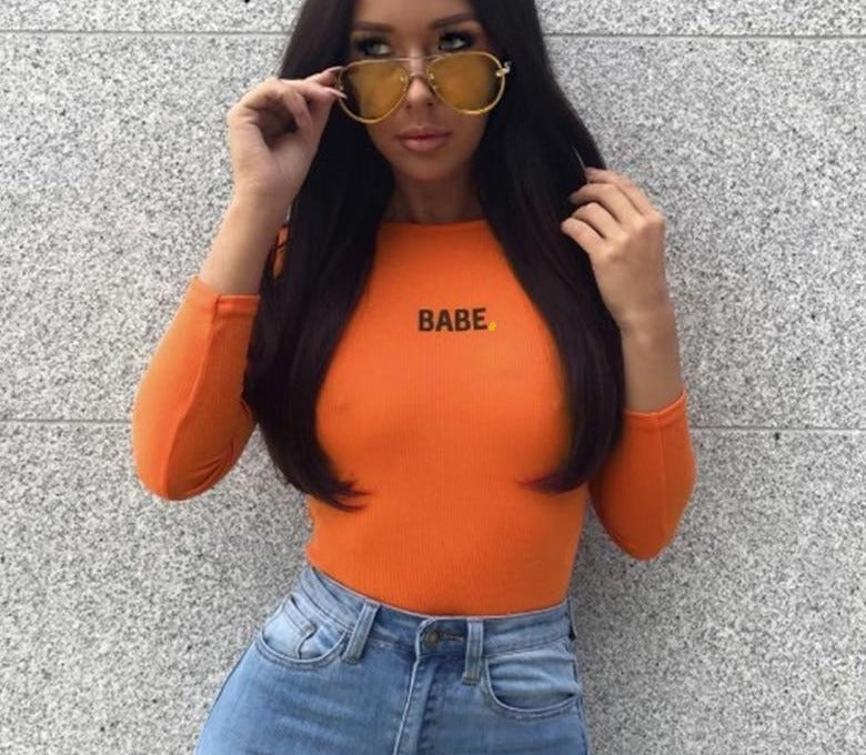 This round neck bodysuit is made of cotton, polyester and spandex. It has long sleeves and is perfect for all day wear. The front of the bodysuit has a print of the word 'Babe' in white, black, and orange. The bodysuit is available in the following sizes: small, medium and large.