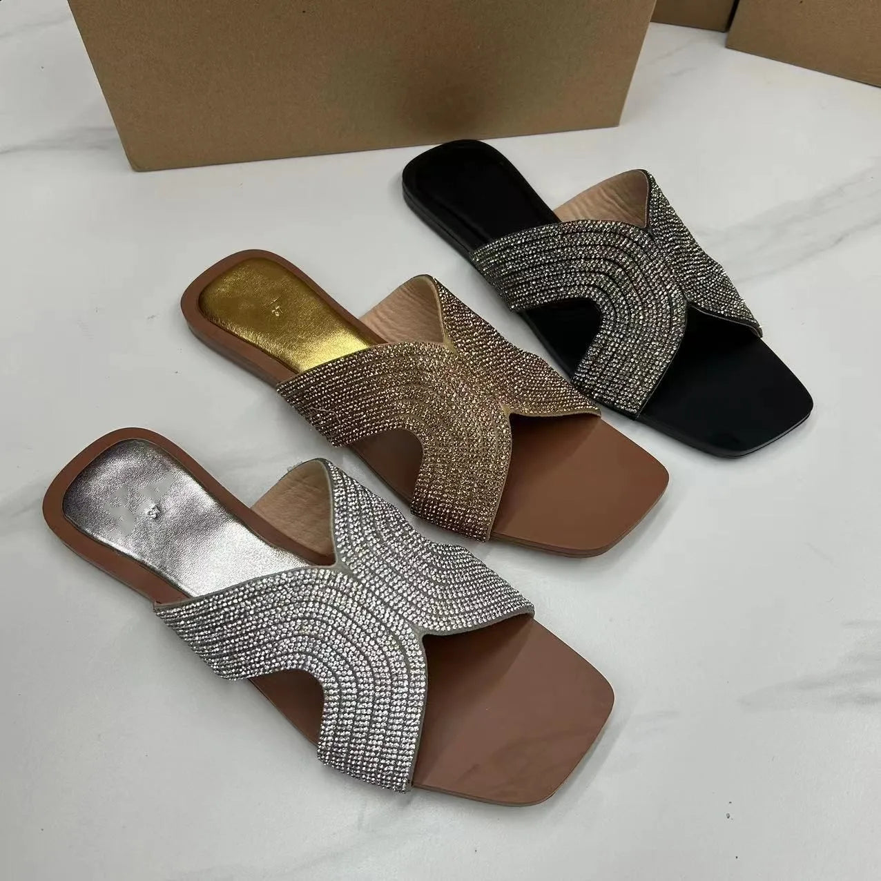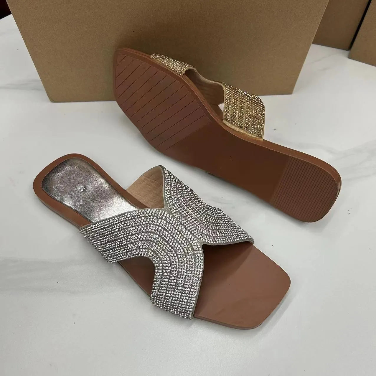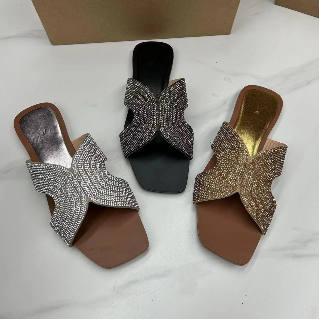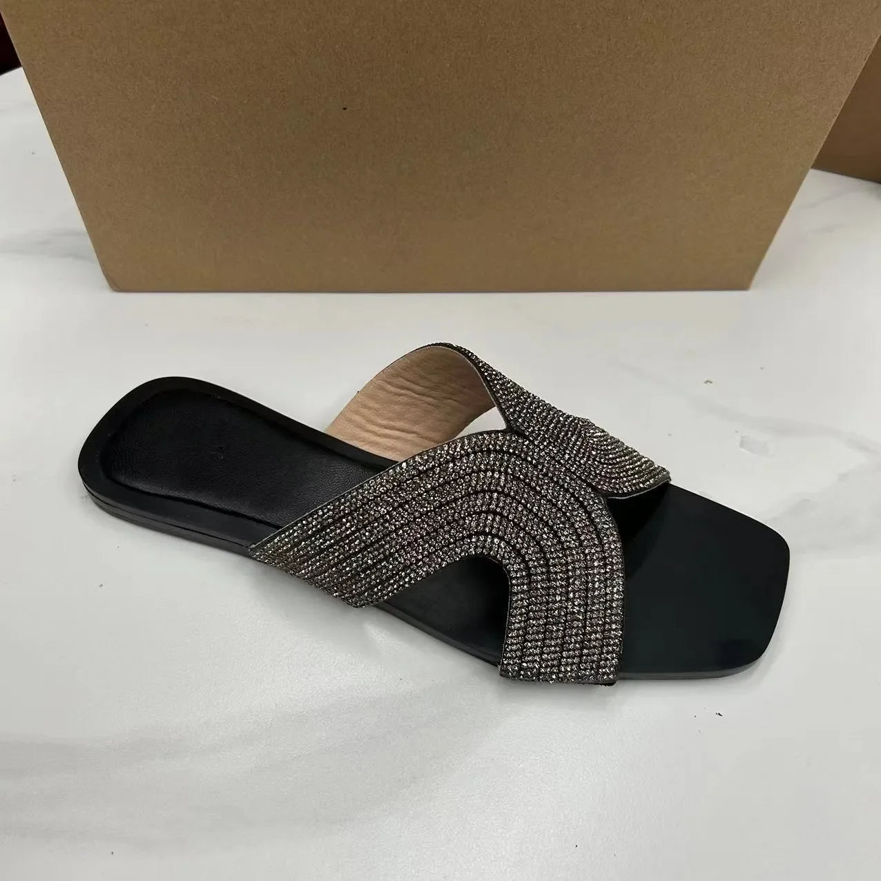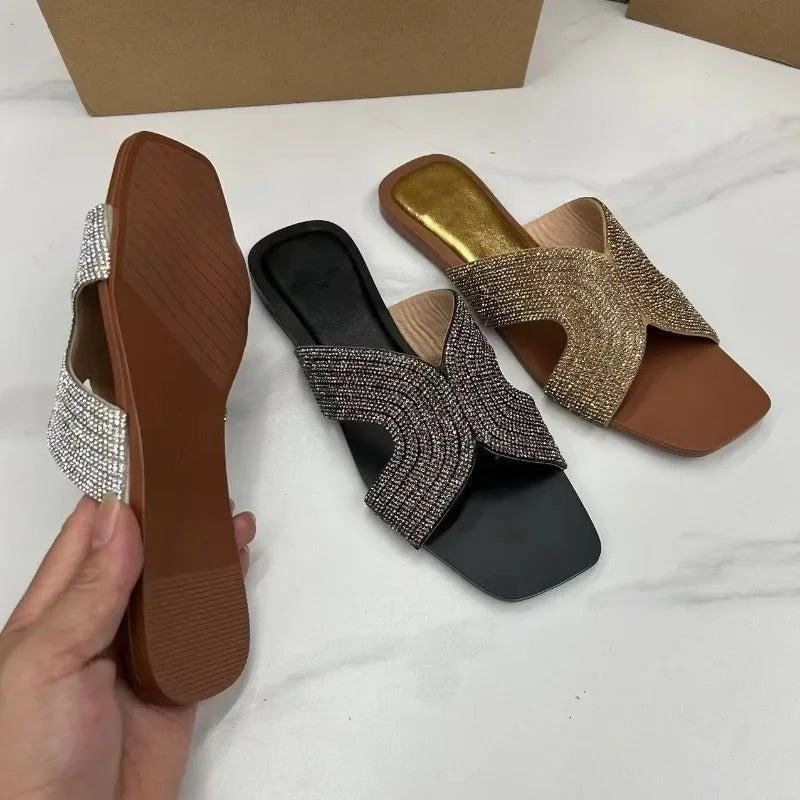 Introducing our luxurious Faux Crystal embellished flat heel sandals, the perfect addition to your summer shoe collection.