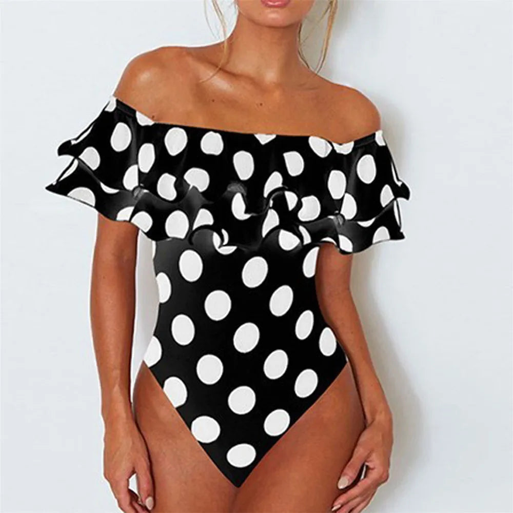 The swimsuit comes in a classic black and white polka dot pattern, giving it a timeless and chic look. The off shoulder style is perfect for showing off your shoulders and neckline, while the size options of S, M, L, 2XL, 3XL, and 4XL ensure a perfect fit for every body type.