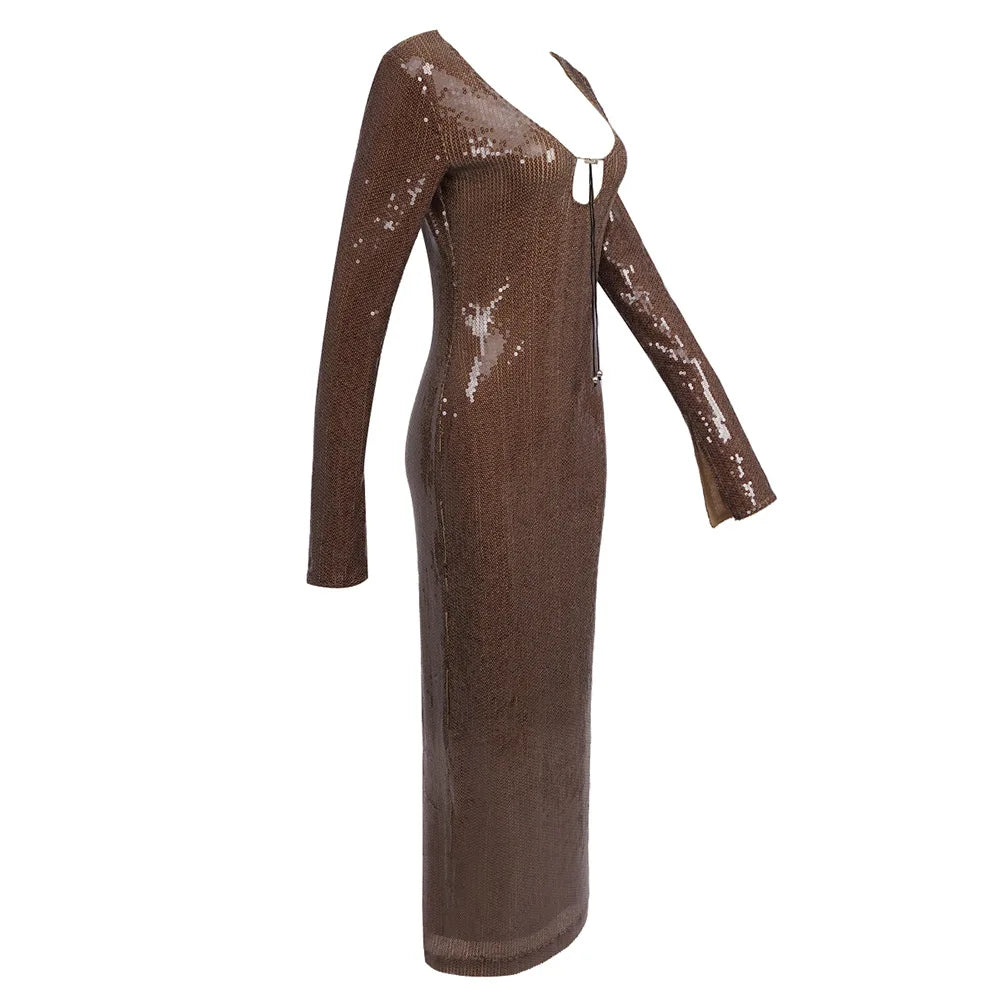 Long Sleeve Mesh Sequin Brown Bodycon Ankle Length Dress