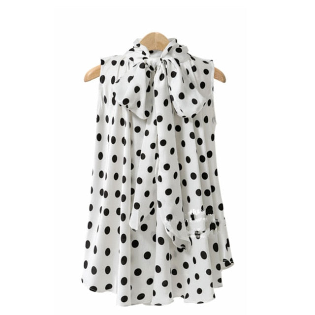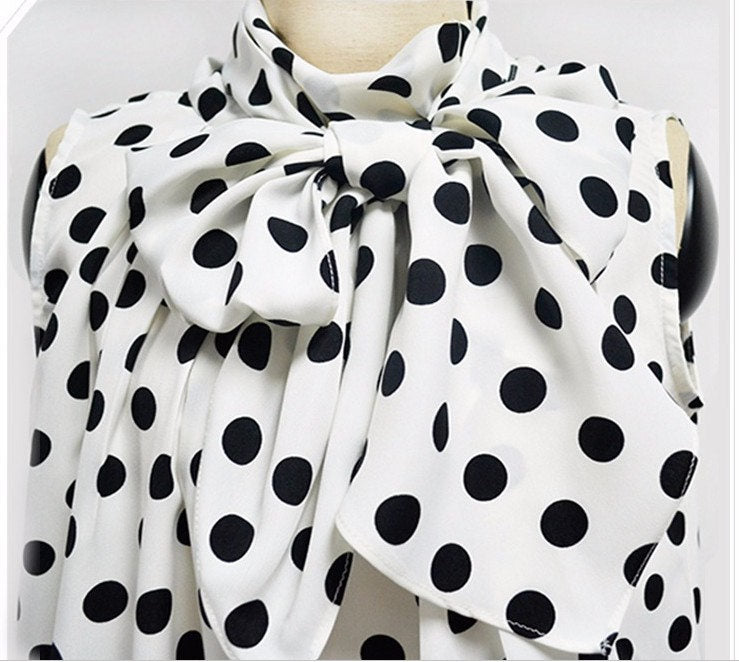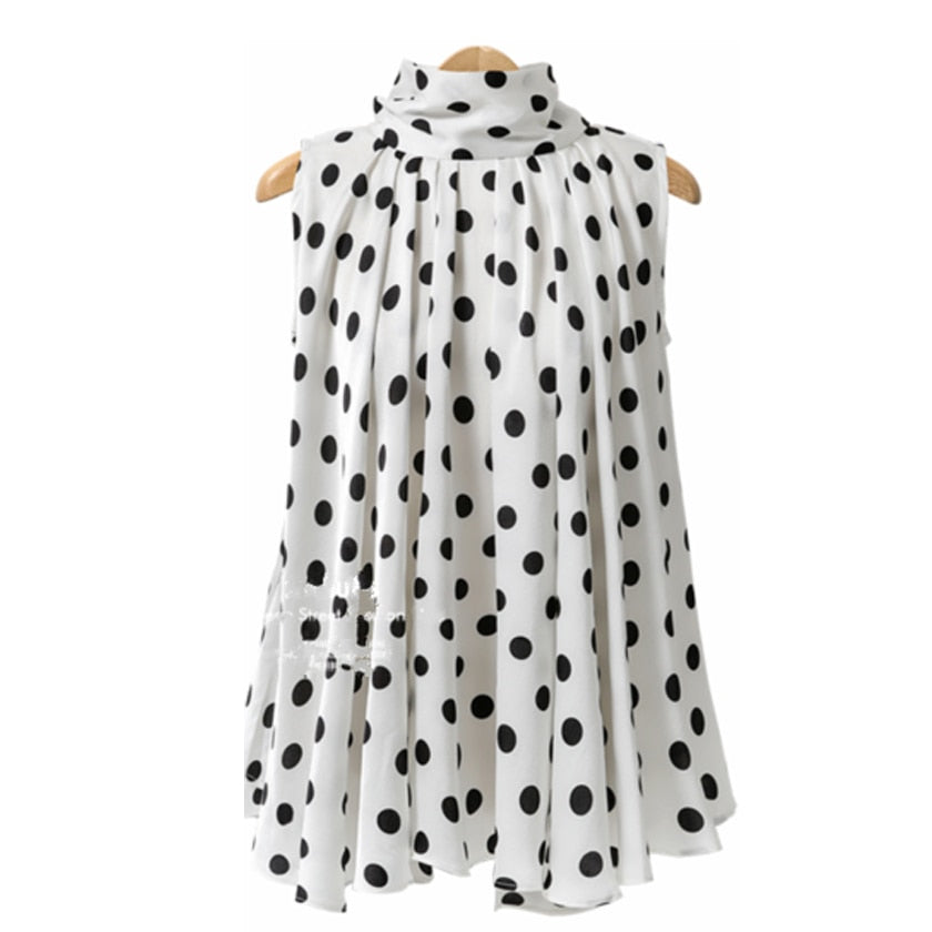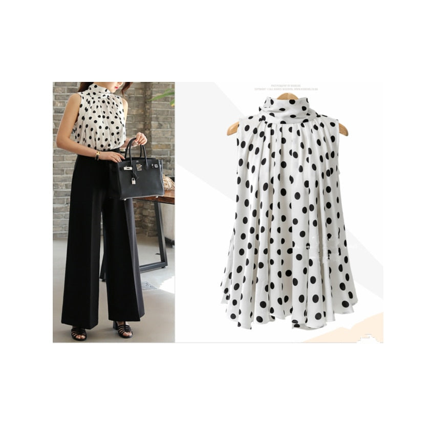This versatile piece is perfect for any occasion, whether it's a day at the office or a night out with friends.Our blouse comes in a classic black and white polka dot pattern, adding a touch of playfulness to your wardrobe. The sleeveless design and turtle neck add a modern twist to this timeless print.