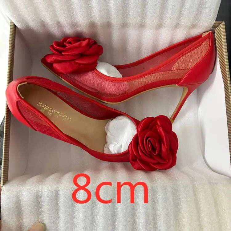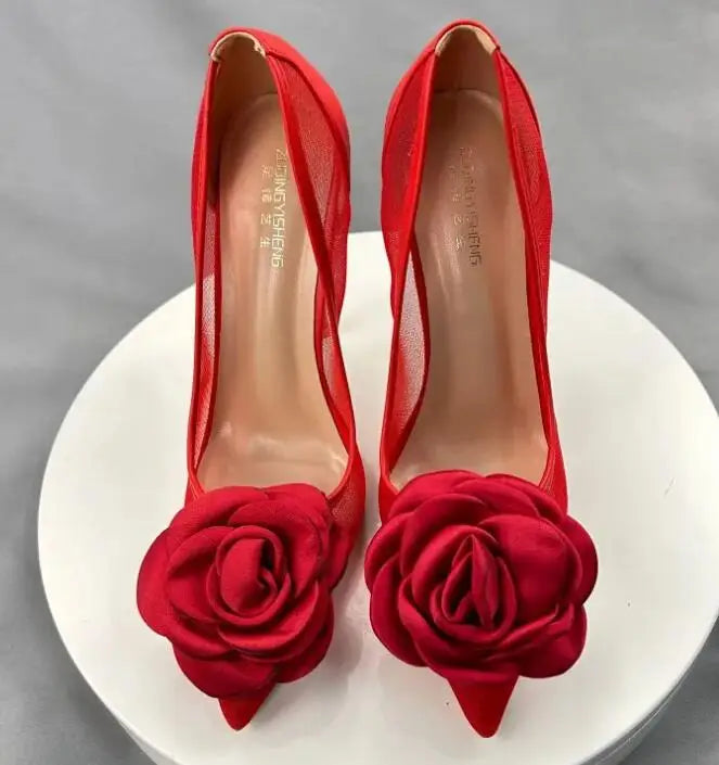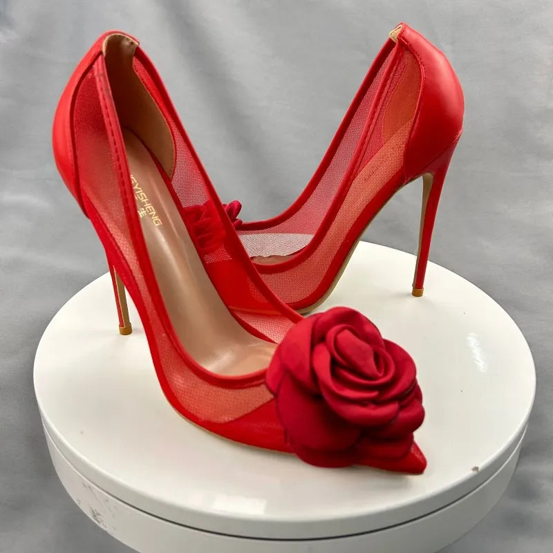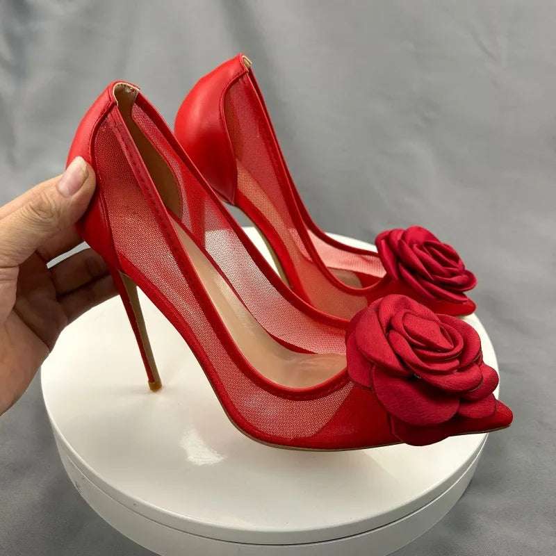 Red Flower mesh Pointy Toe Stiletto High Heel shoes
