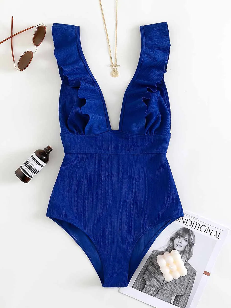 Upgrade your swimwear collection with the Ruffle Deep V One Piece Swimsuit today.