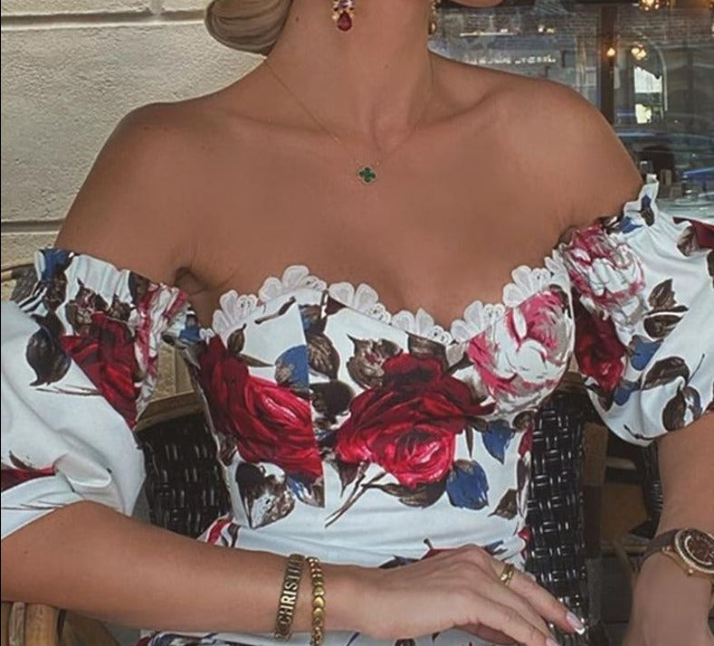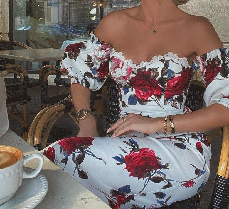 You'll never want to take this body-con dress off! It features a sweetheart neckline with a off-shoulder design, puff sleeves and fitted bodice. The dress features a printed design of flowers. Pair this dress with your favourite heels and jewellery for a stunning look.