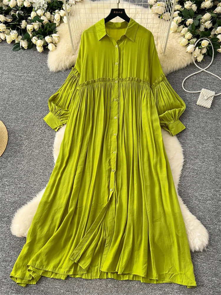 The solid color and single-breasted design give this dress a classic look, while the casual folds and long length make it perfect for any occasion. Whether you're dressing up for a special event or keeping it casual for a day out, this dress is versatile enough to suit any style.