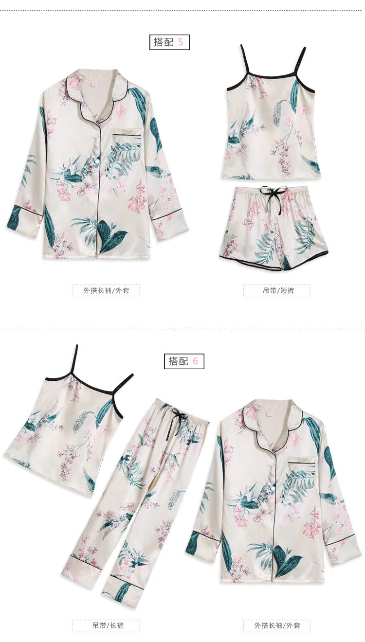 Made from high-quality satin material, this set is both comfortable and luxurious. The set includes a camisole, shorts, pants, bag, eye mask, hair tie, and a matching storage bag. The soft and smooth texture of the satin fabric will make you feel like you're sleeping on a cloud. The lovely colors and prints adds a touch of femininity to the set, making it a perfect gift for yourself or a loved one.