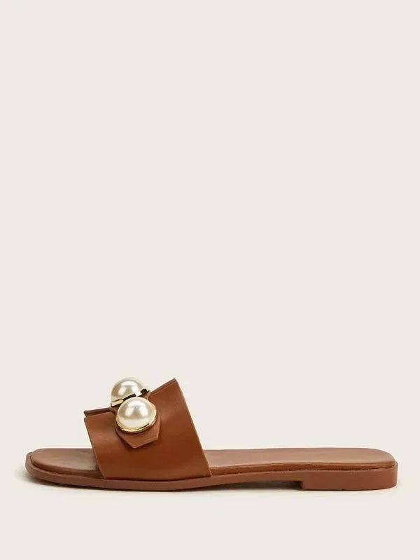 The one-piece structure ensures a secure fit and easy slip-on style. Perfect for the beach or a day out, these Faux Pearl Flat Heel Sandals are a must-have for any fashion-forward woman.