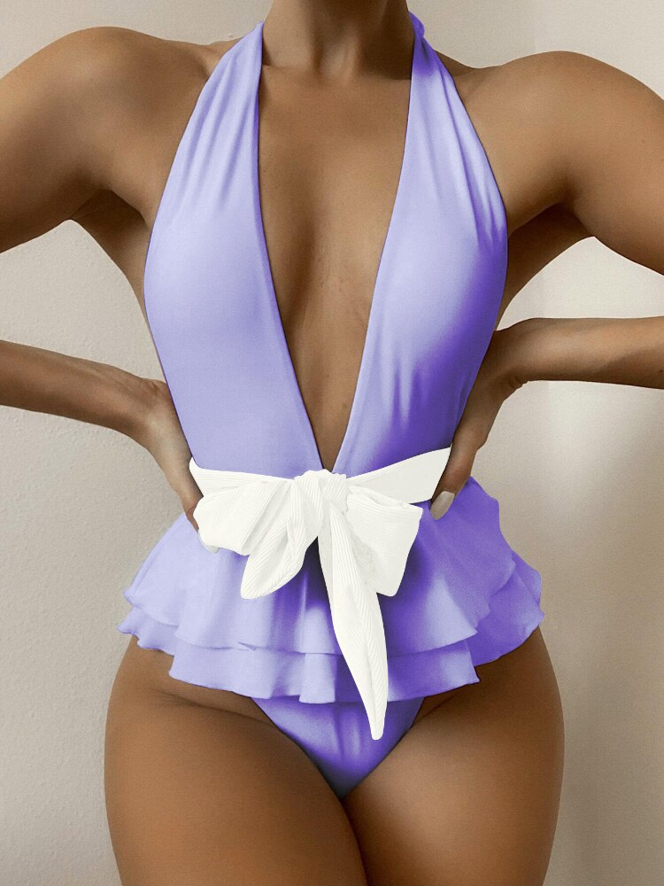 This Bow belt plunge One-piece Swimsuit is a high-quality, elegant, and stylish bathing suit option. It features an adjustable bow belt that creates a classy and flattering look. The adjustable fit ensures an ideal and comfortable wear. Perfect for the beach or pool, you won't be disappointed with this chic and flattering swimsuit.