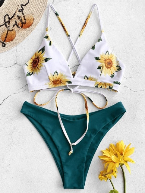 Do you want to feel like you're on a tropical vacation? Get your sunflower printed bikini set! This is the perfect swimwear for any beach day, whether you're at the pool or on the shore. The bottoms have a tie back closure and they're available in a variety of sizes. You'll love the vibrant colours of this swimsuit and the cute prints!