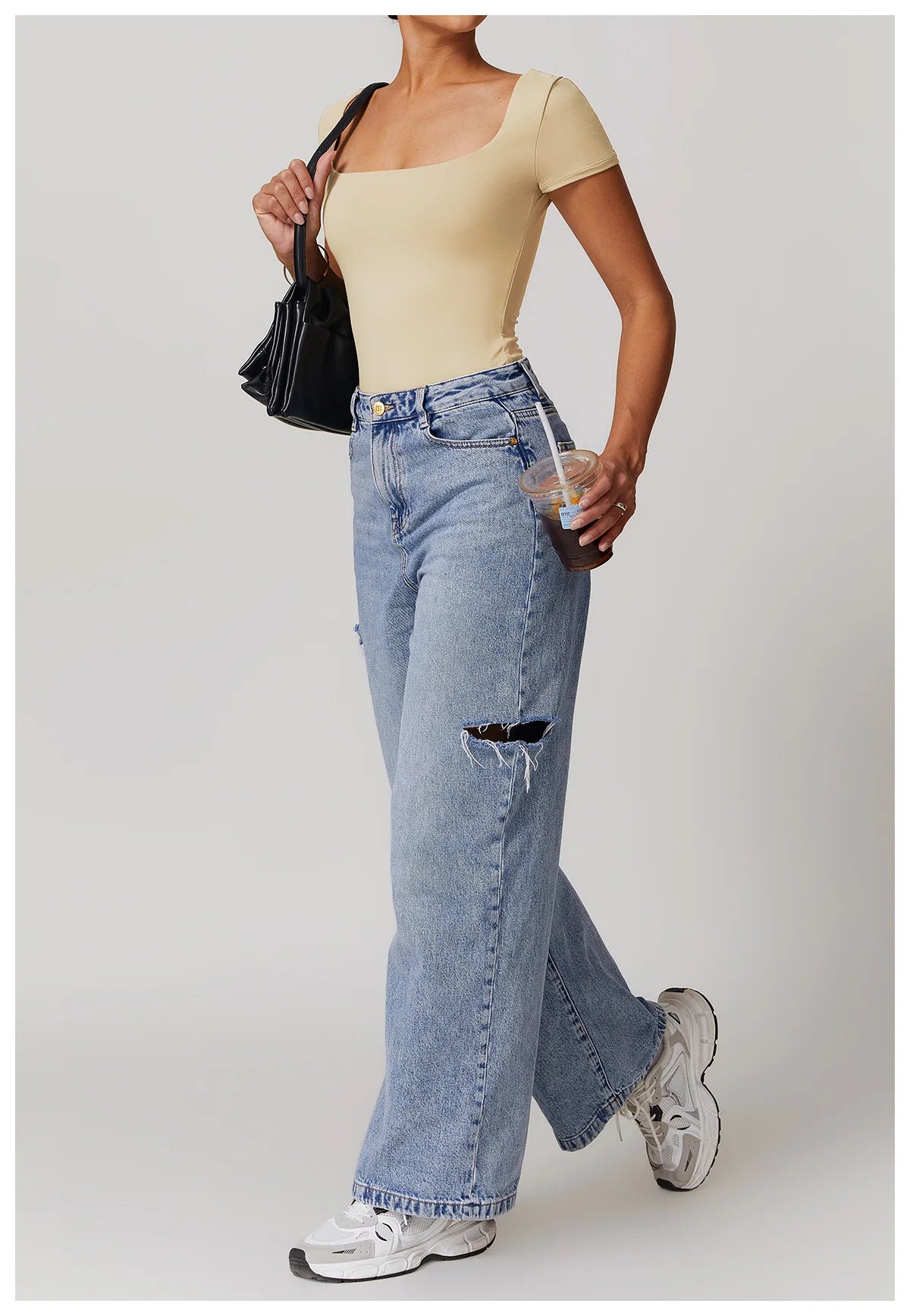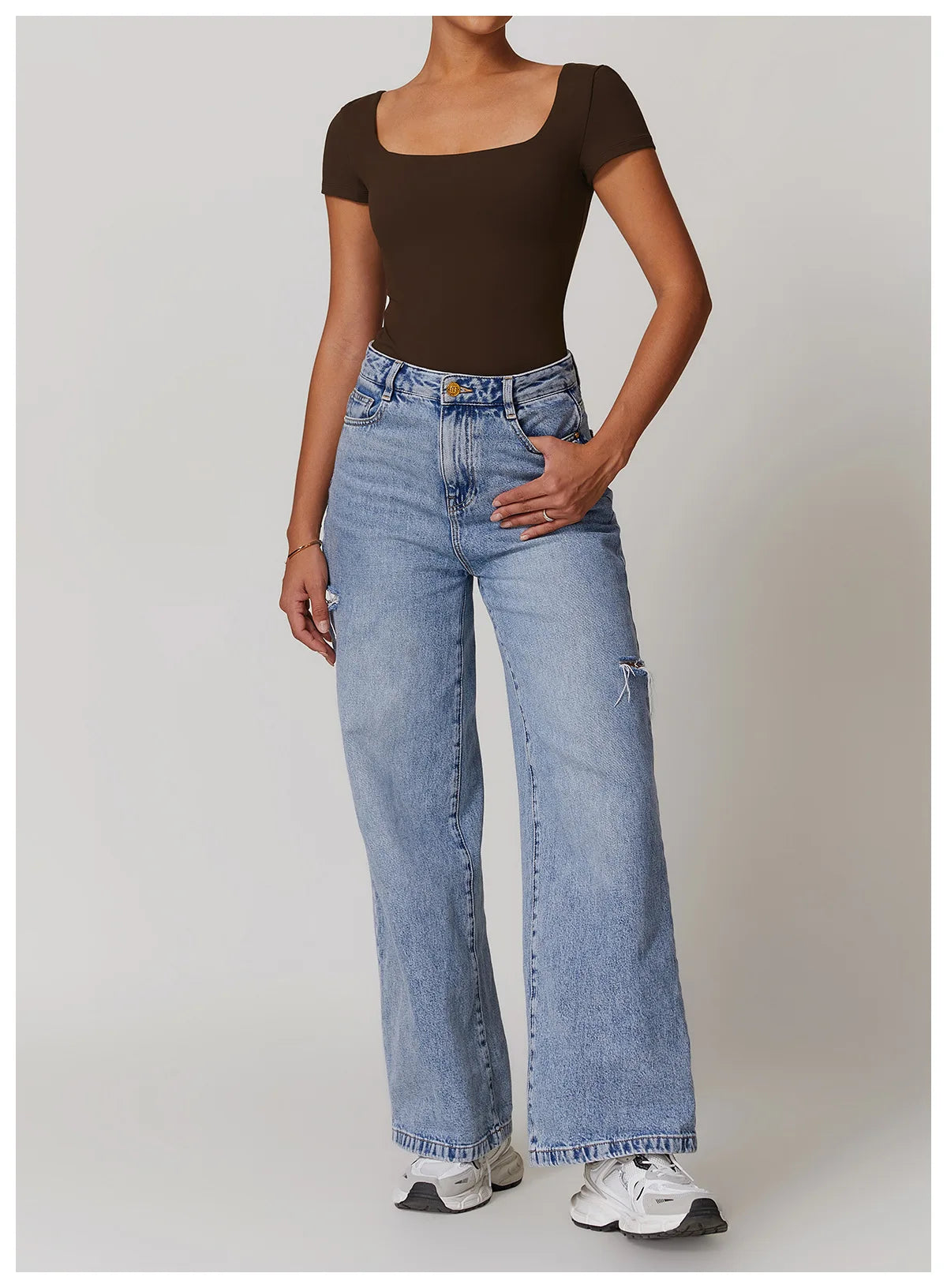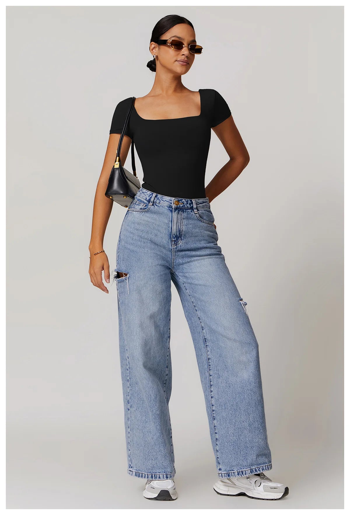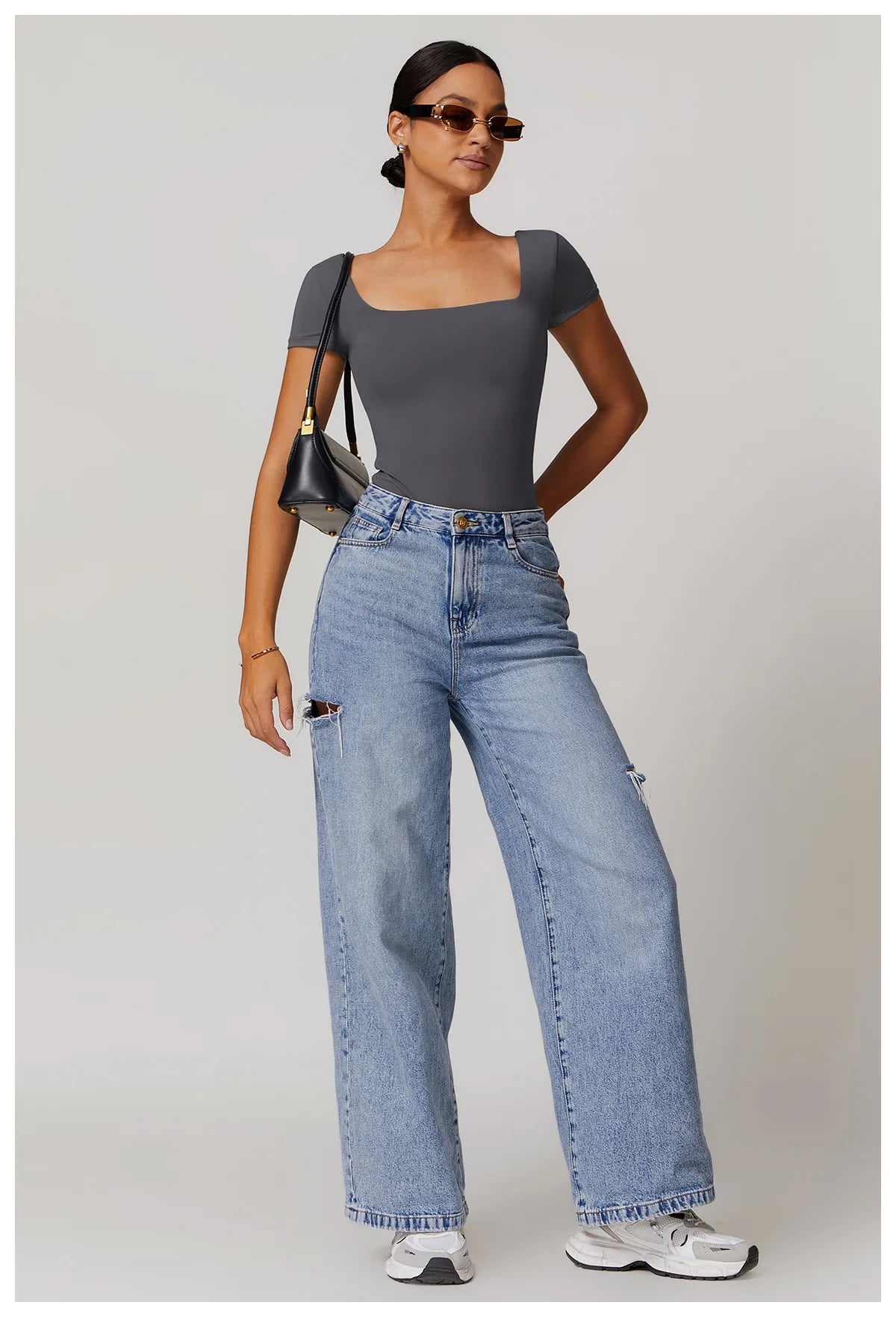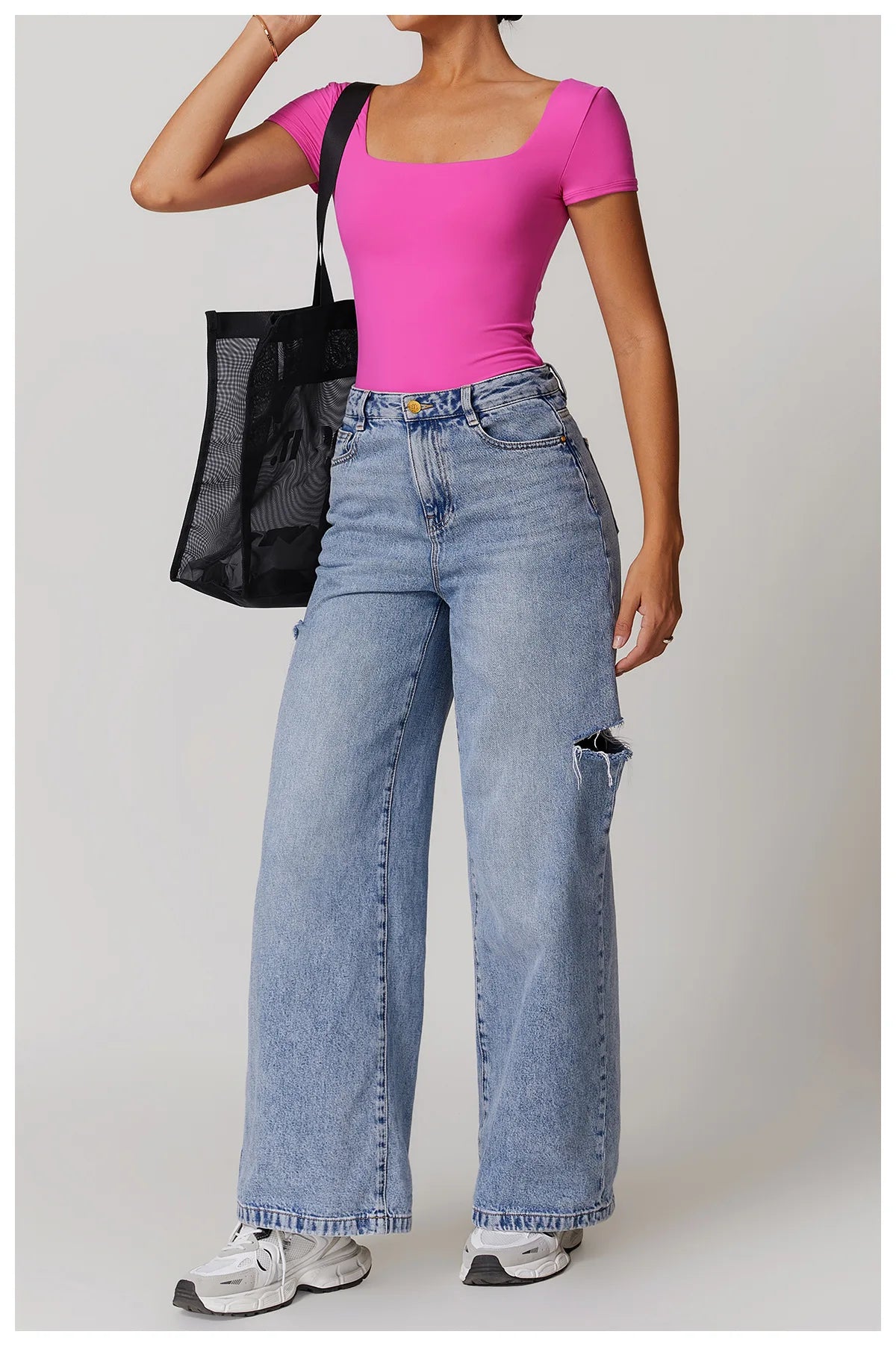 Introducing the ultimate workout essential - the Square Neck Short Sleeve Gym Training Yoga Bodysuit.