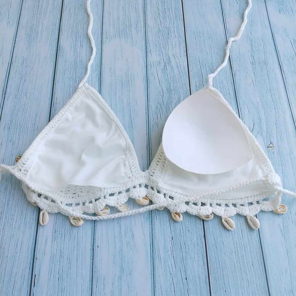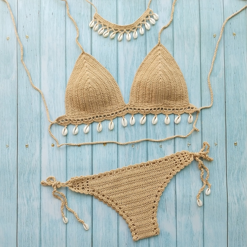 The bikini set includes a halter top with attached tie, matching bottoms and a crochet necklace! The halter top is adorned with an eye-catching crochet design that ties at the neck and back. The bottoms are cheeky and cute at the same time. The set is made of a soft fabric that will provide comfort and durability.