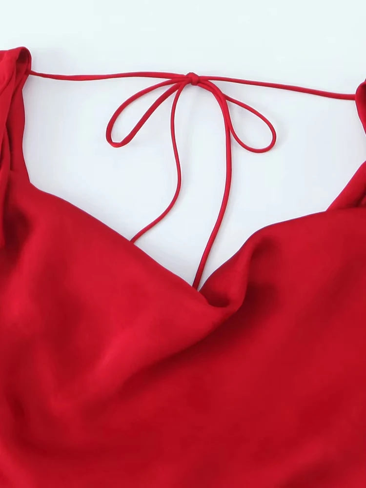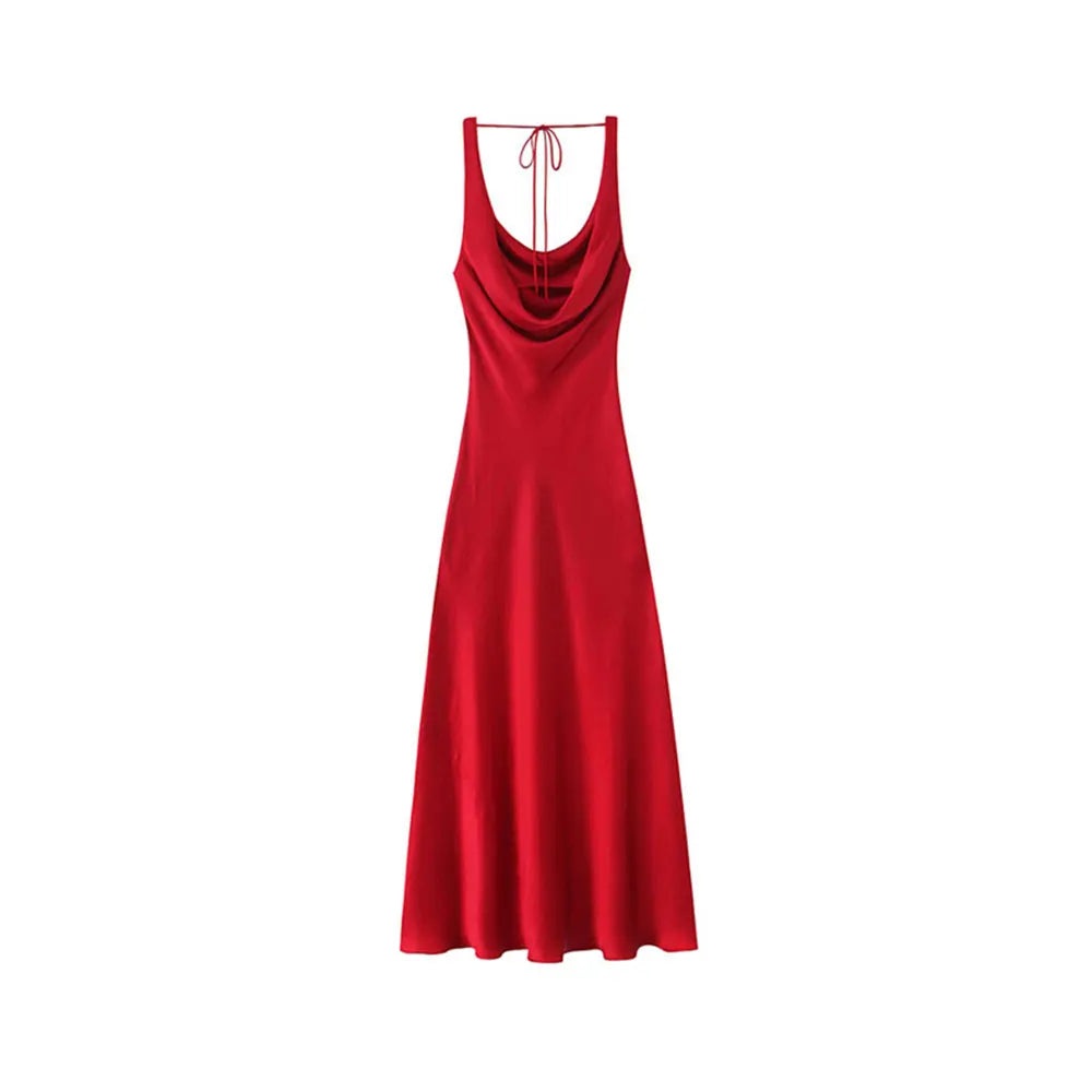 The back of the dress features a tied detail, adding a playful and feminine touch. The flowing silhouette of the dress creates a flattering and effortless look, making it suitable for any body type. Whether you're going to a formal event or a casual outing, this dress is versatile and can be dressed up or down.
