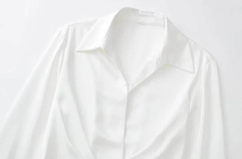 The gathered satin fabric adds a touch of vintage charm, while the v-neck and long sleeves give it a modern twist.
