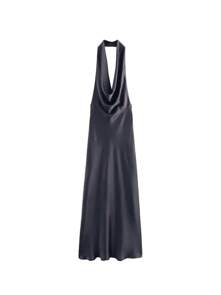 It features a halter neck design with an open back, adding a touch of sexiness to the overall look. The midi length and sleeveless style make it suitable for both casual and formal events.