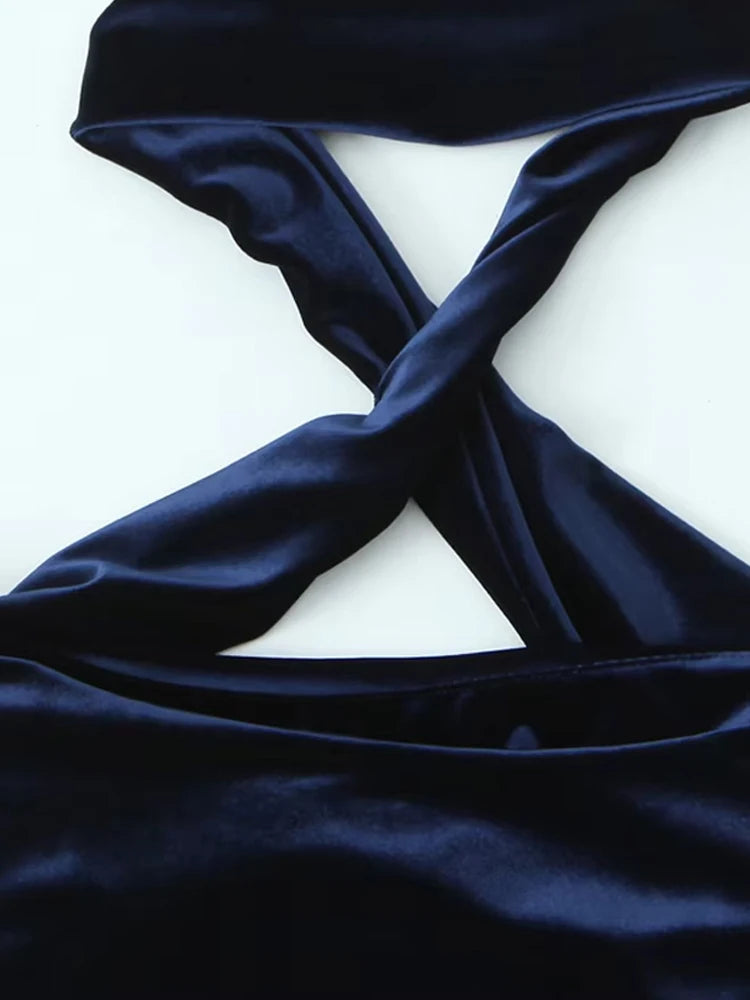 The halter neck design adds a touch of elegance, while the side zipper allows for easy wear and removal. The straight neck and back across strap add a unique and flattering detail to this piece.