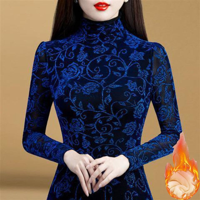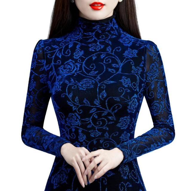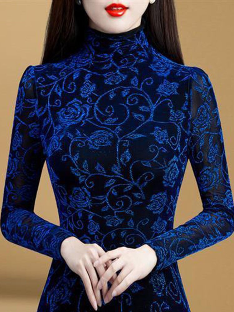 The Turtleneck Flower print Long Sleeve Top is a top made from polyester. The design features a long sleeve and a turtleneck. The top is available in various colours, such as blue, green, and brown.