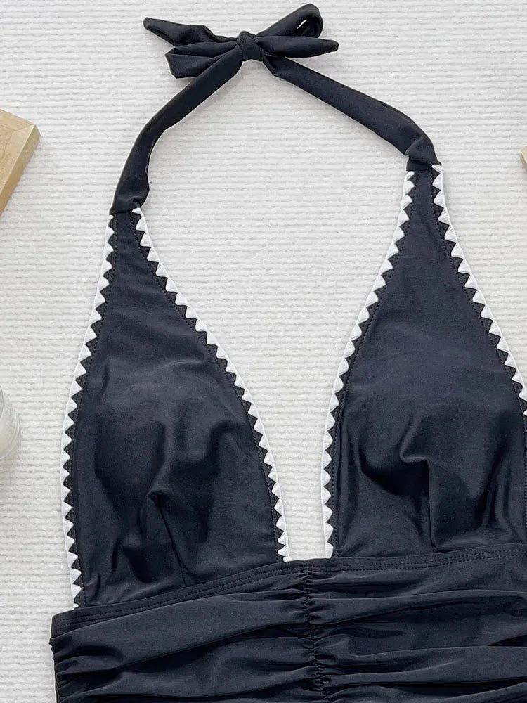 The Halter Deep V Backless One Piece Swimsuit is a stylish and alluring addition to any summer wardrobe.