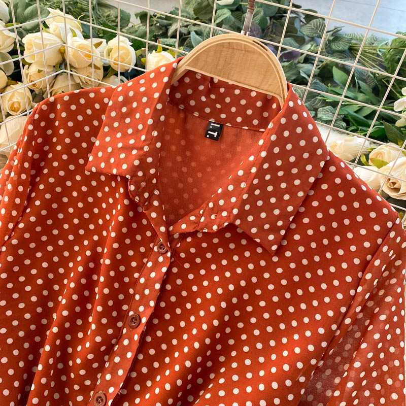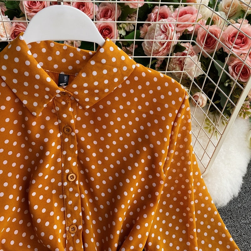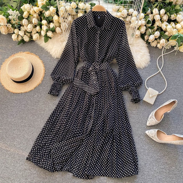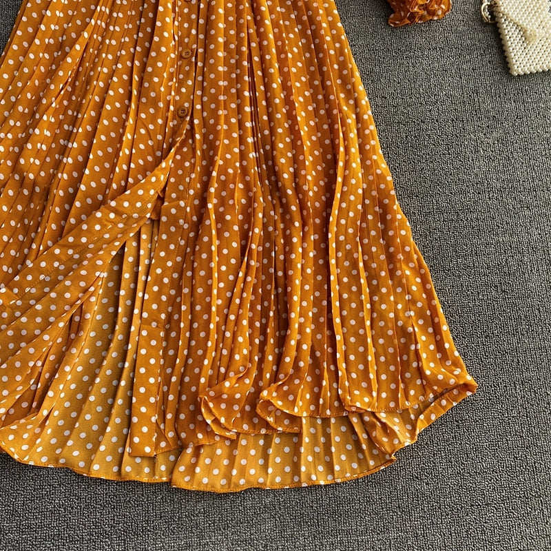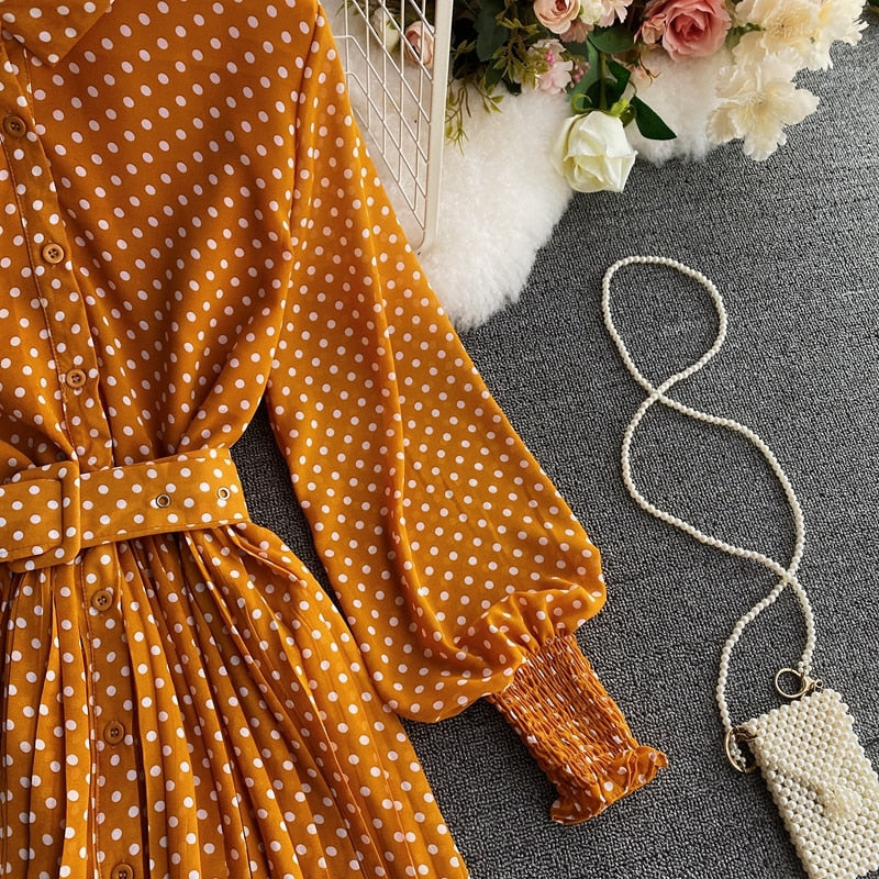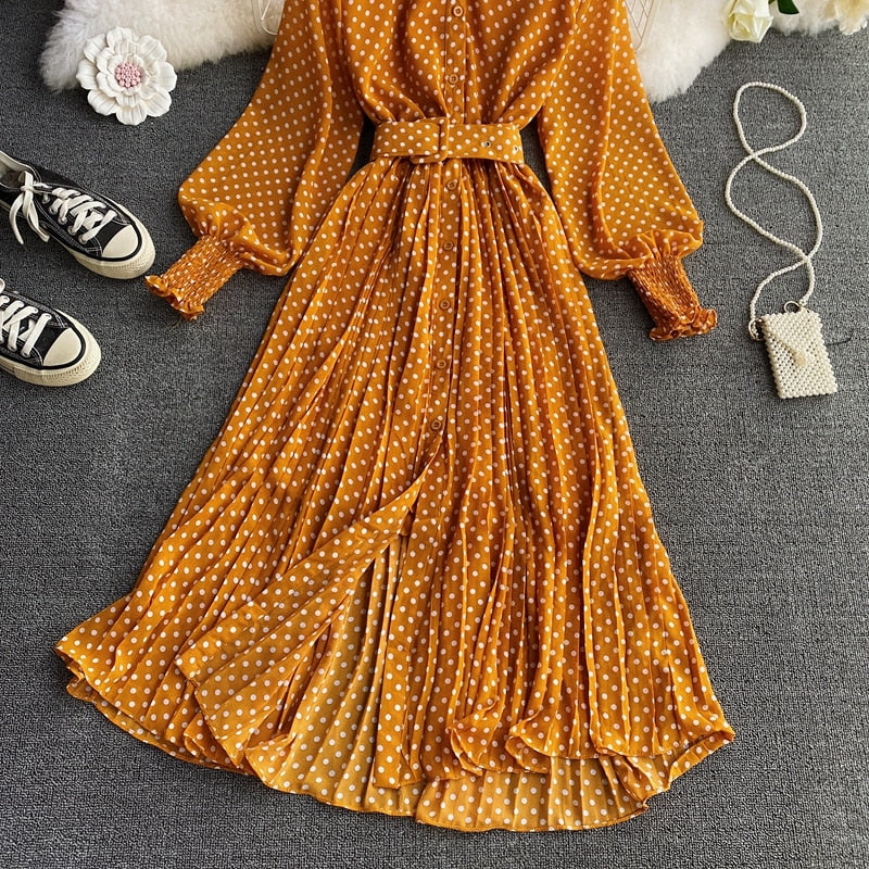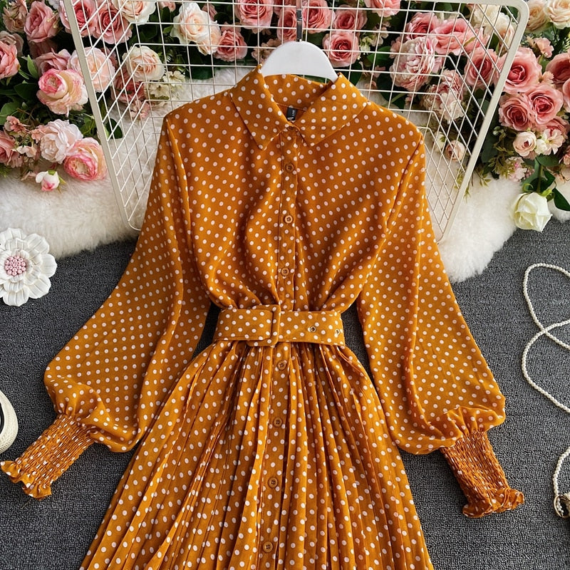 This beautiful vintage maxi dress is the perfect combination of feminine and chic. The beautiful vintage polka dot pattern is eye-catching and the long sleeves will keep you cool. This dress is made of polyester and is machine washable. It is available in one size.