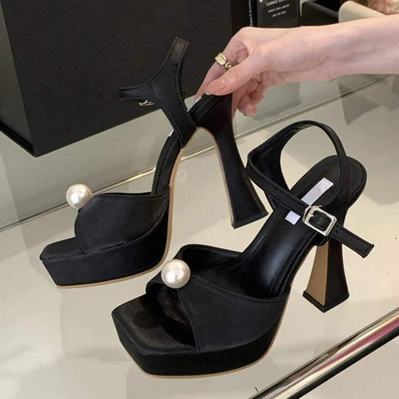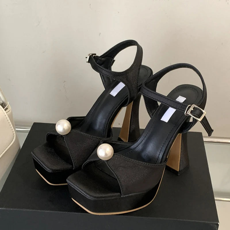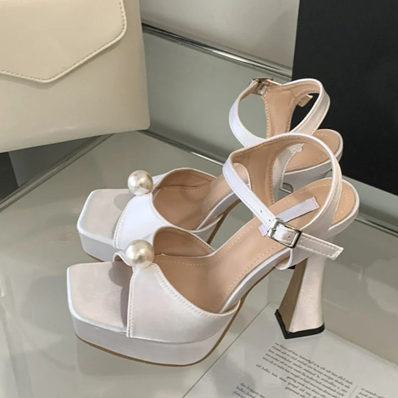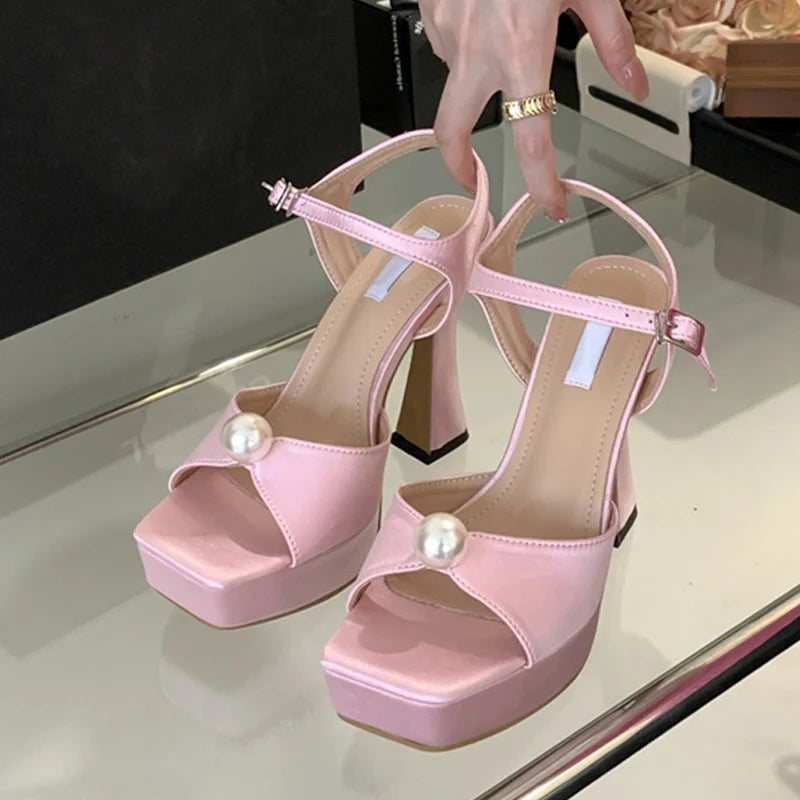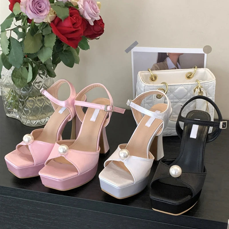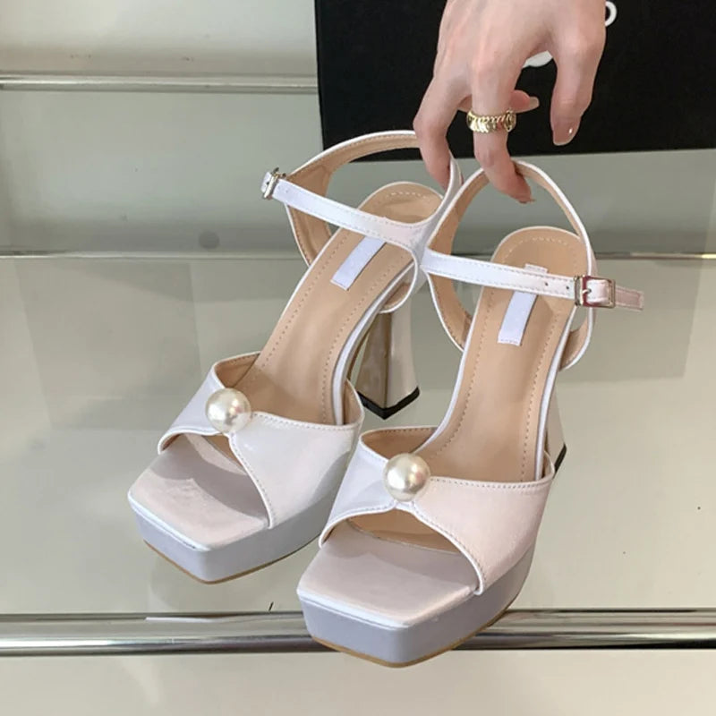 Women faux Pearl Design Square Toe platform Super High Heel Sandals