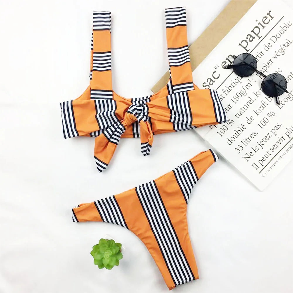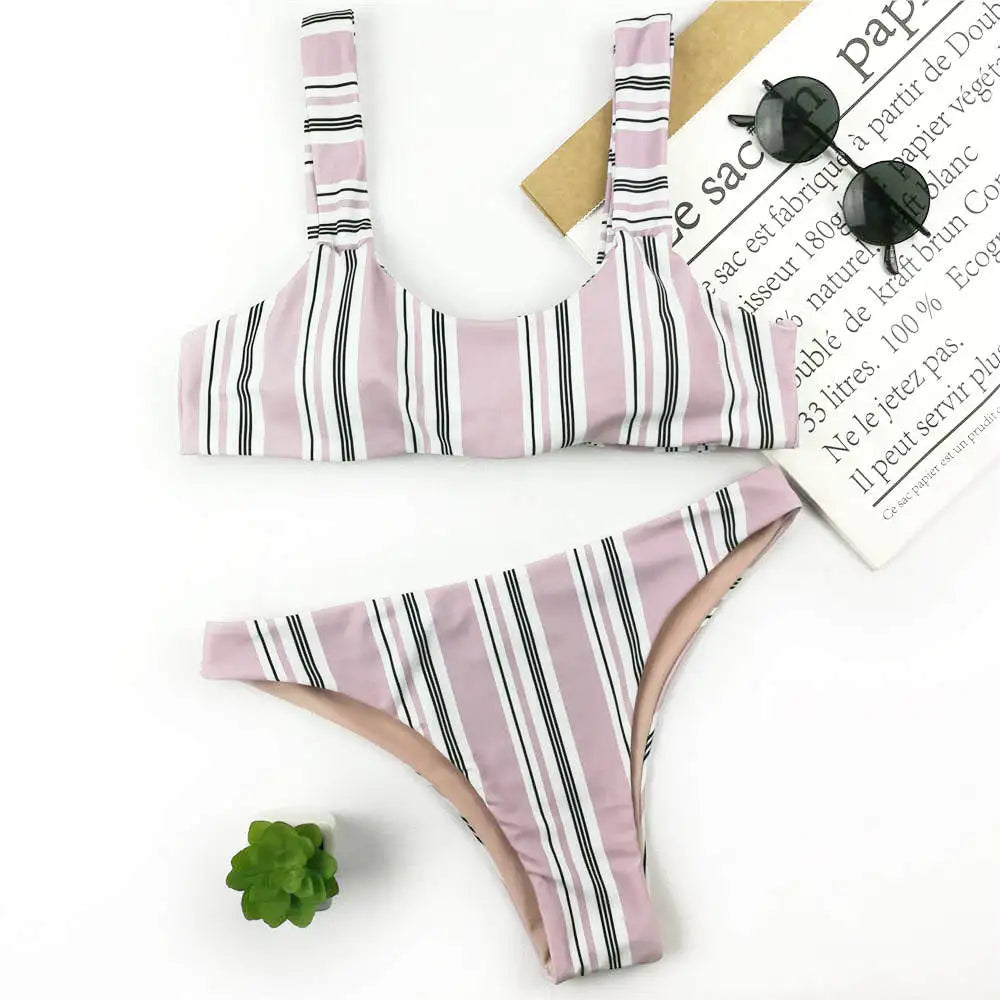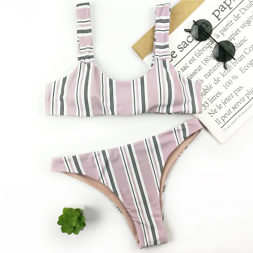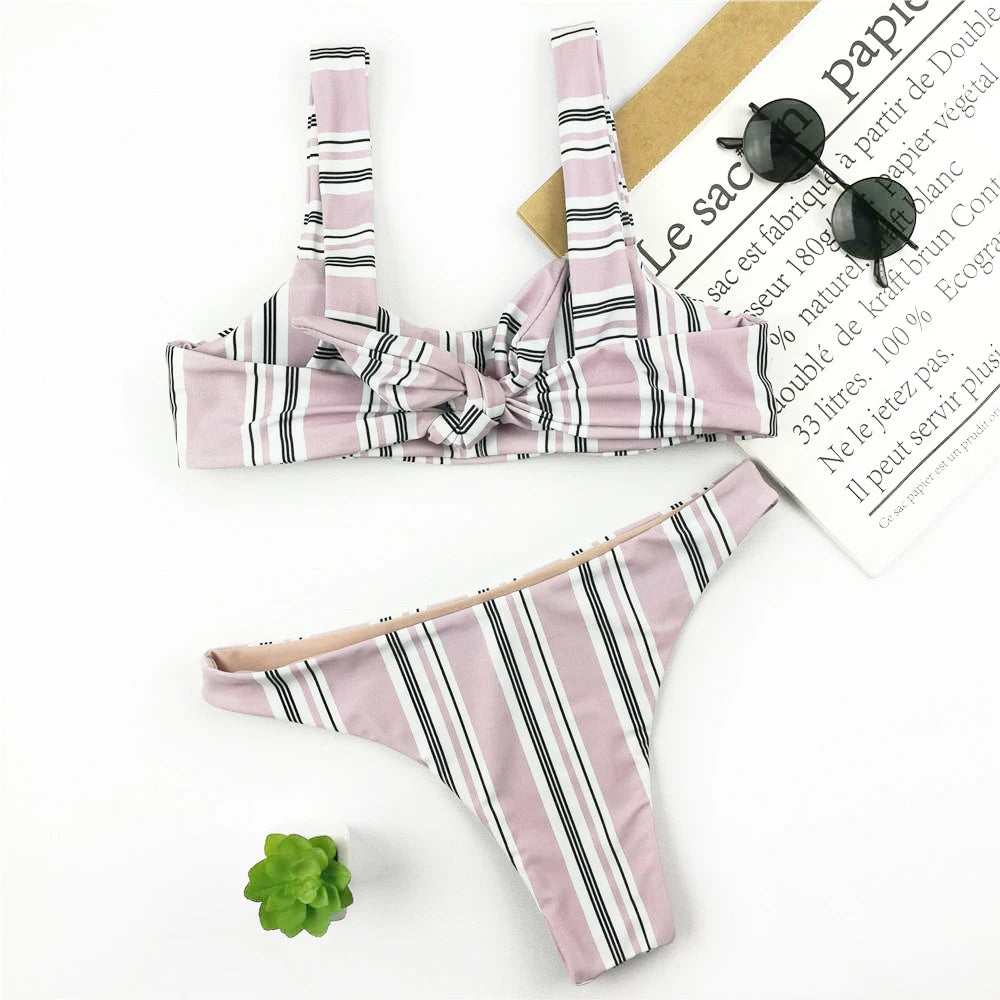 The striped pattern adds a fun and playful touch to the design, while the low waist cut gives a flattering and modern look.
