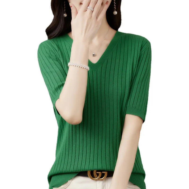 Get ready for some serious style with this Women Short Sleeve V-neck Stripe Knitwear top! Perfect for a casual day out or a fun night on the town, this top features a flattering V-neck and trendy stripes. Don't miss out on this must-have addition to your wardrobe!