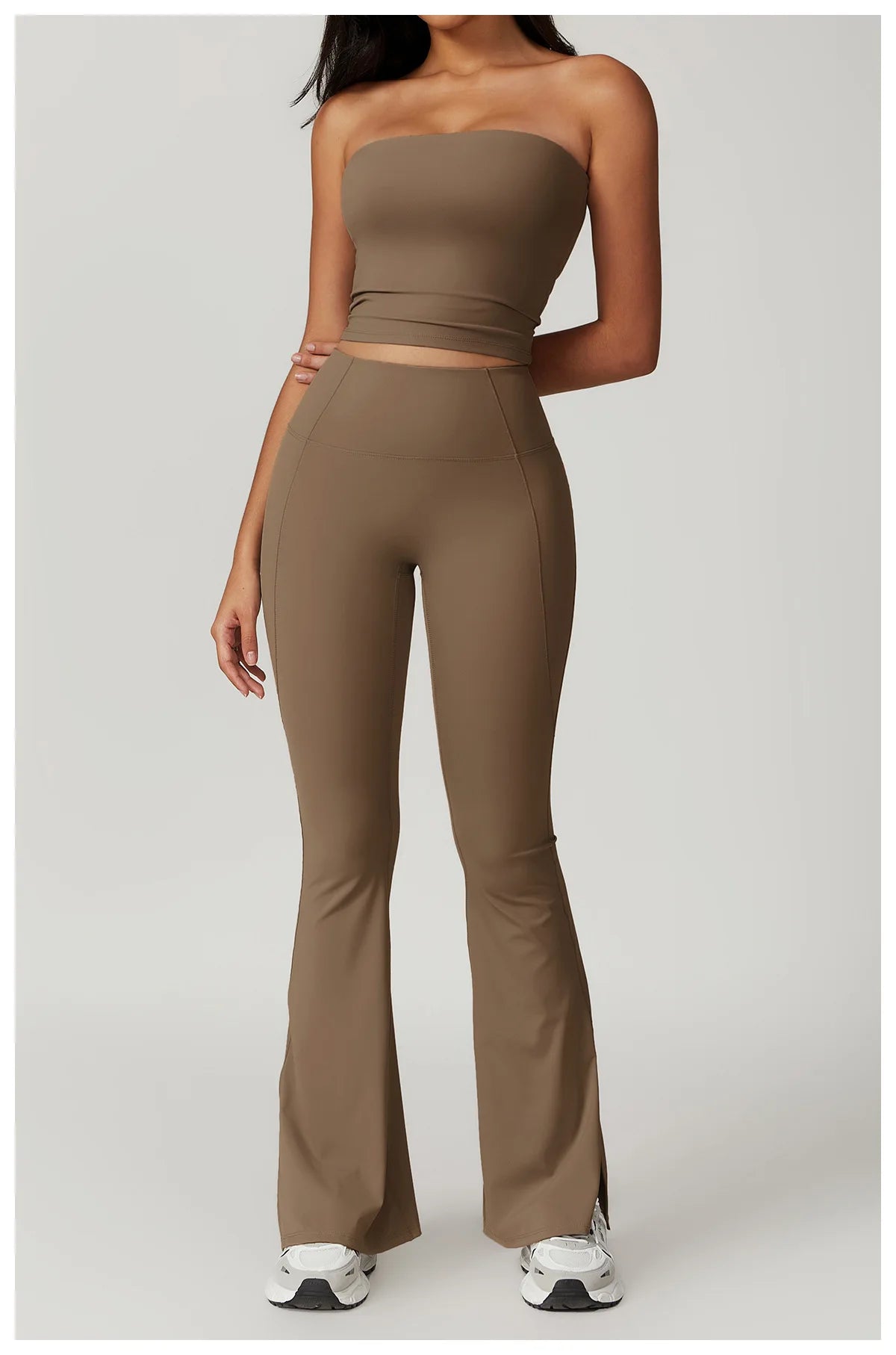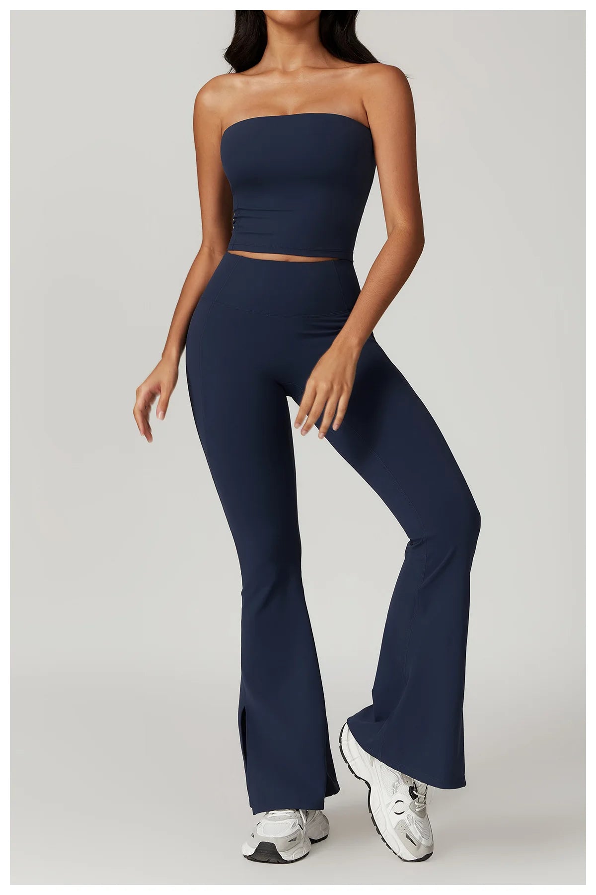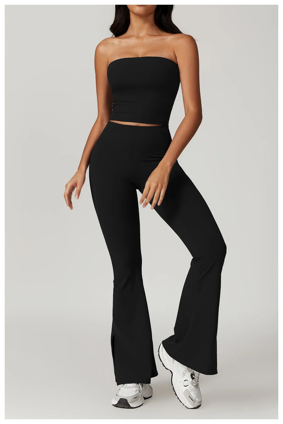 The bandeau top provides a sexy and breathable option for those intense gym sessions, while the leggings offer a comfortable and flexible fit. The set is designed to be both stylish and functional, with a flattering bell-bottom design on the leggings and a form-fitting silhouette on the bandeau top.