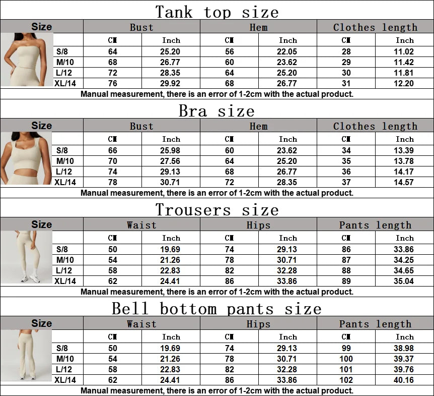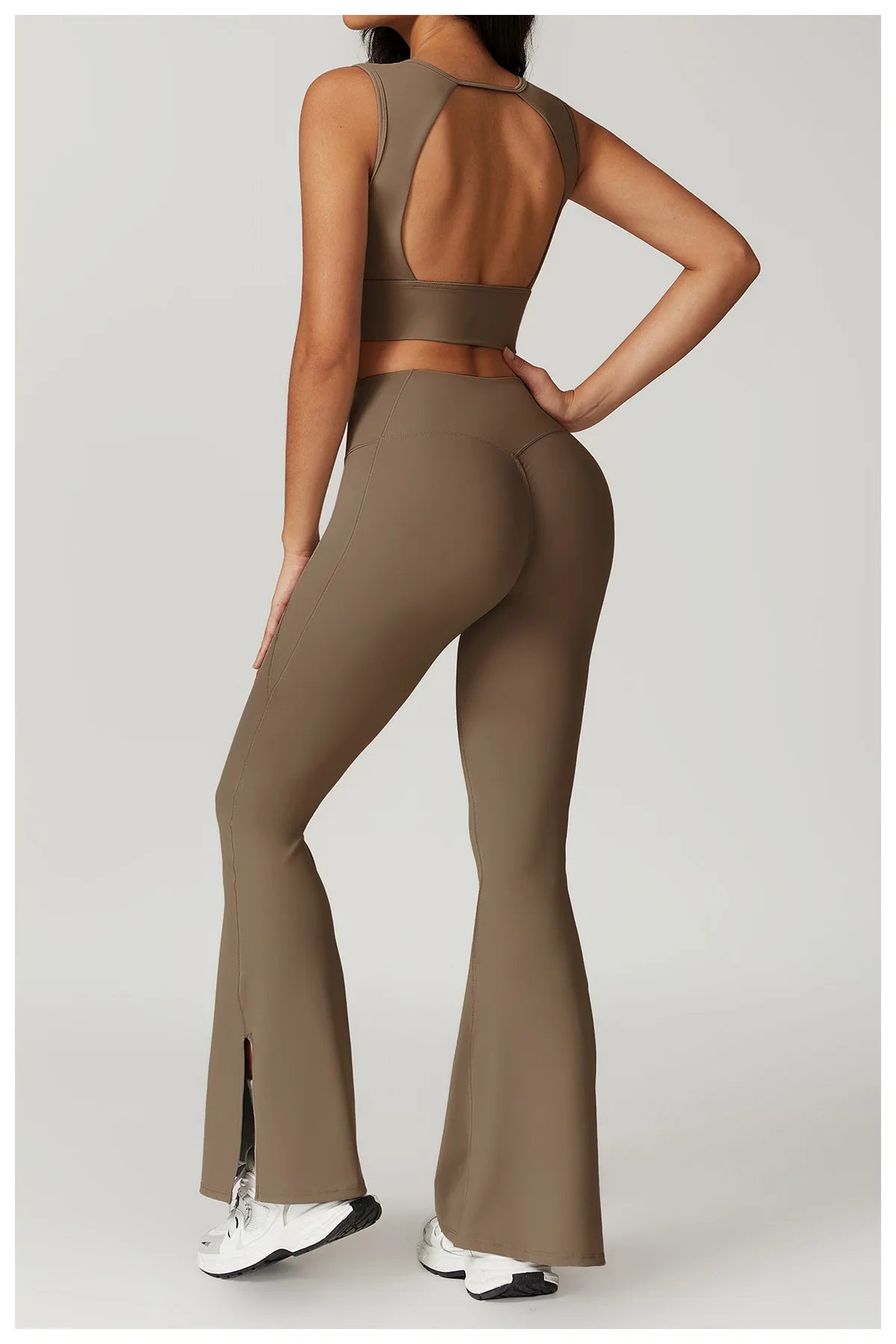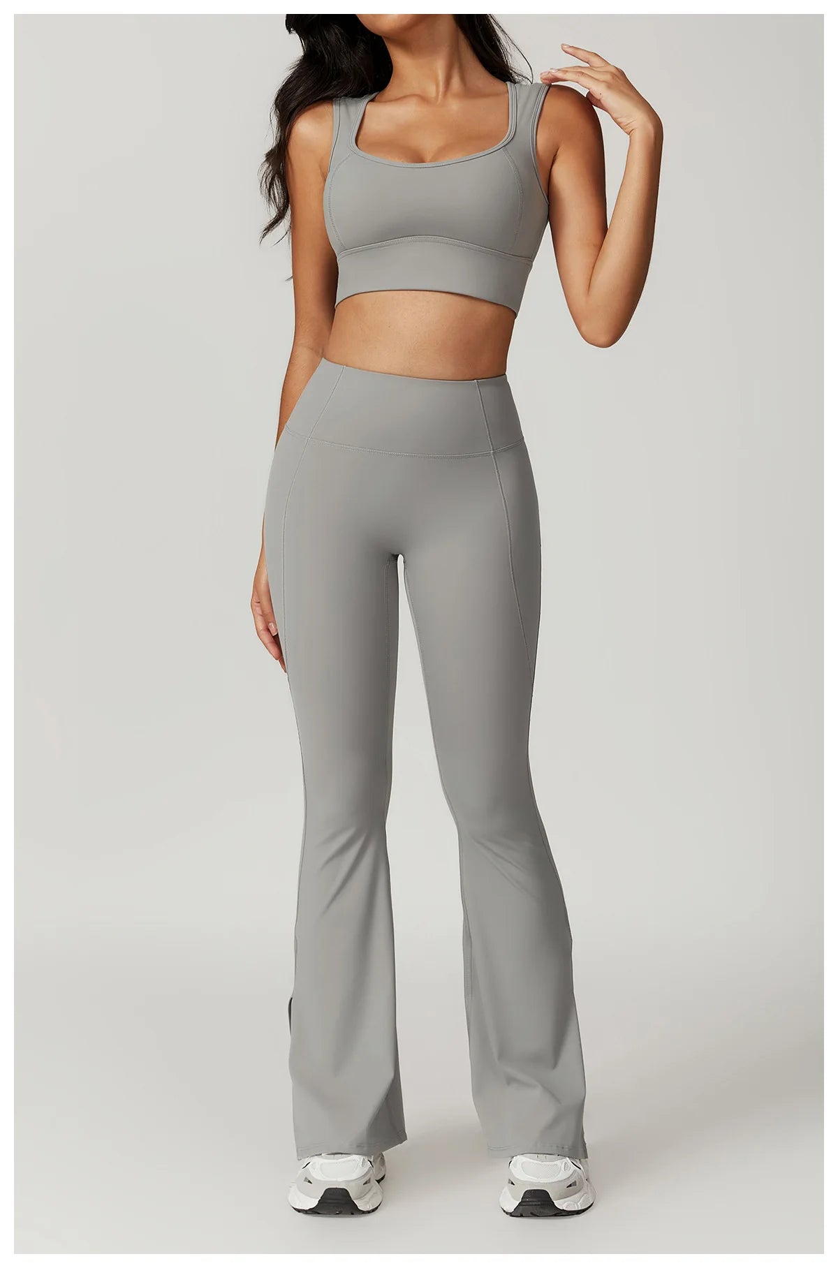 The bandeau top provides a sexy and breathable option for those intense gym sessions, while the leggings offer a comfortable and flexible fit. The set is designed to be both stylish and functional, with a flattering bell-bottom design on the leggings and a form-fitting silhouette on the bandeau top.