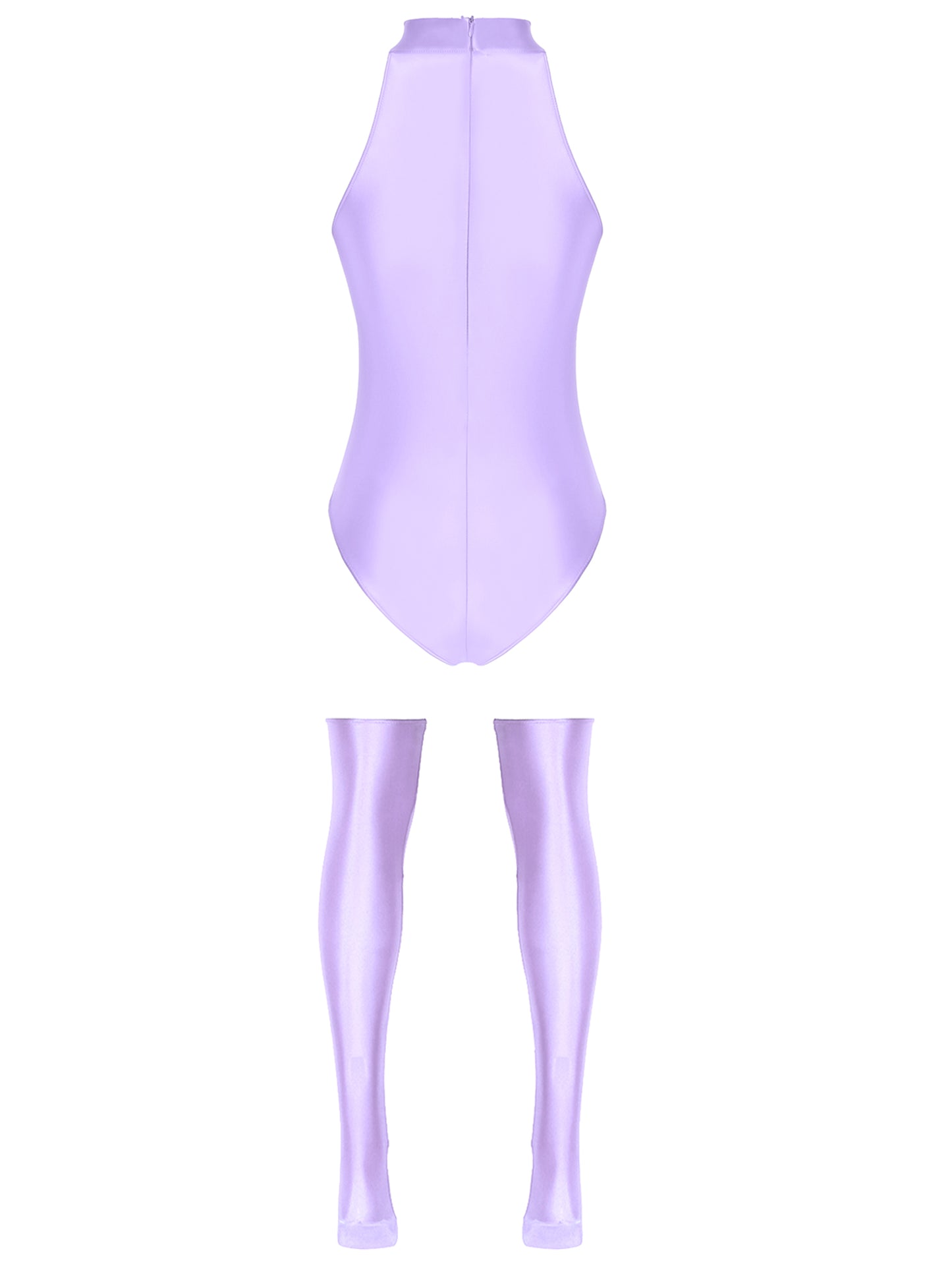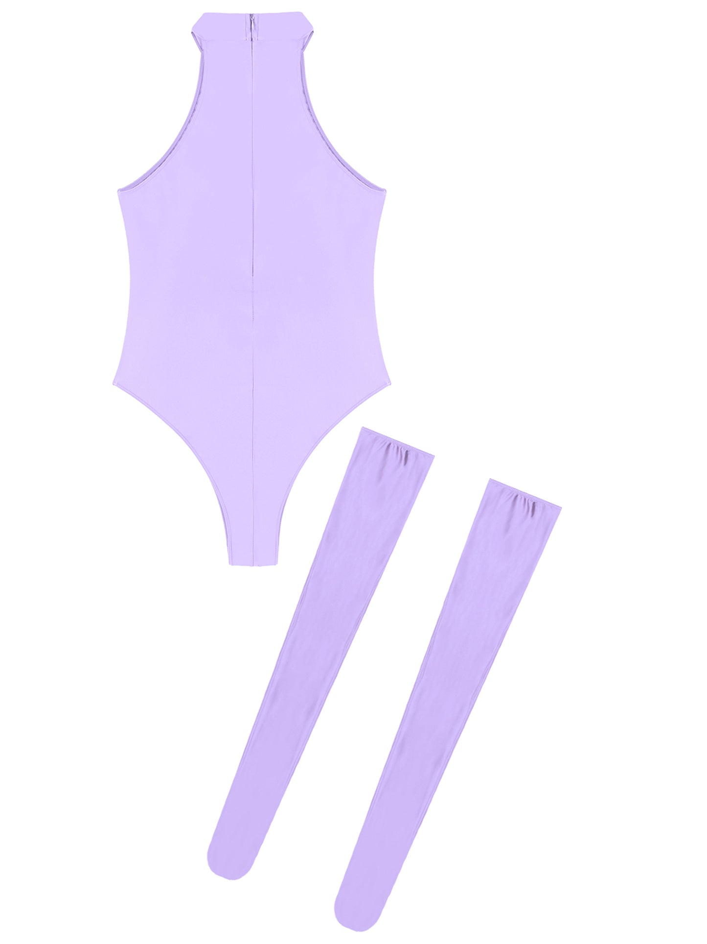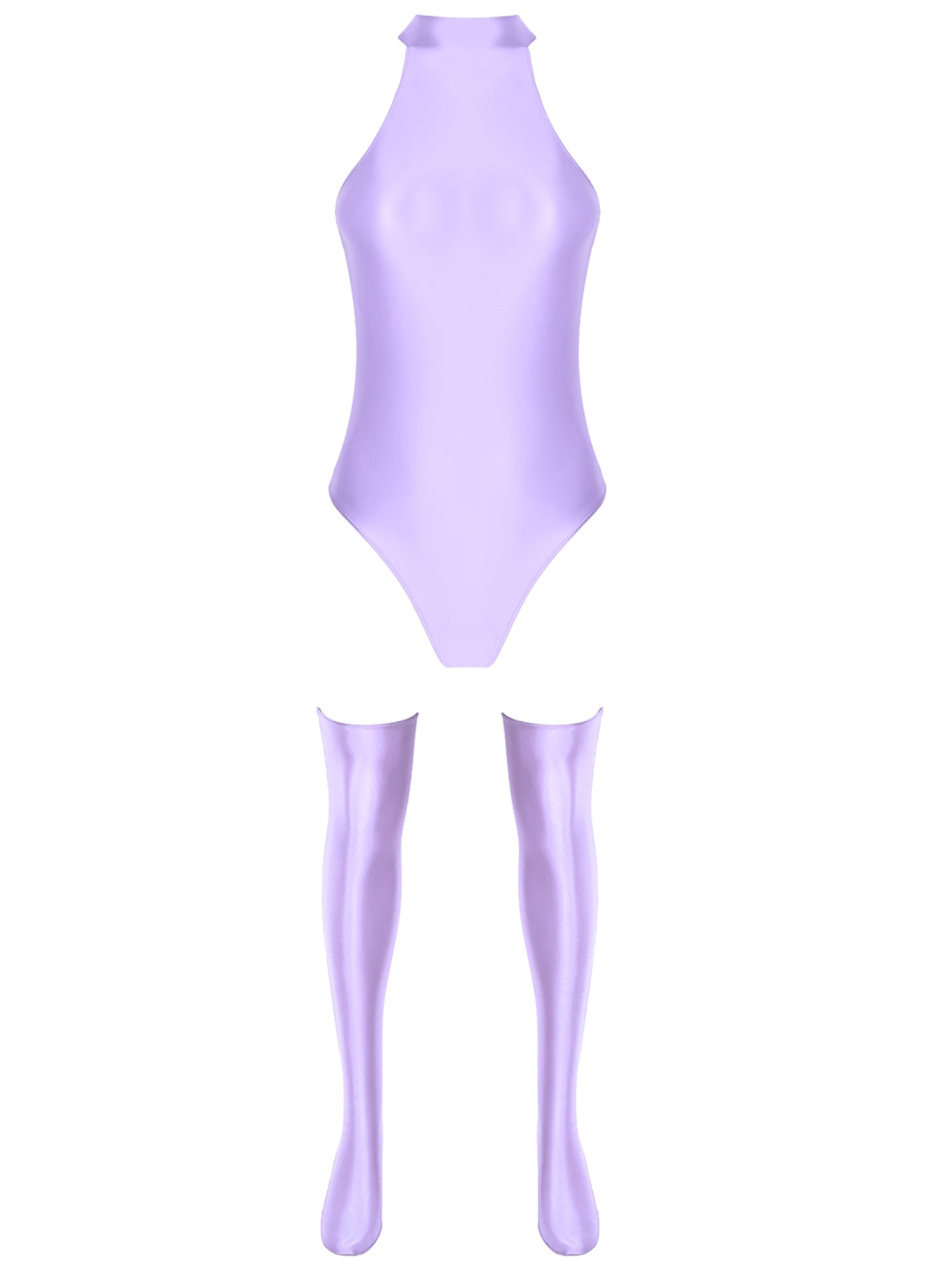 The glossy finish adds a touch of sexiness and elegance to the overall design. The mock neck and sleeveless style give it a modern and chic look, while the thigh-high stockings add a touch of playfulness.