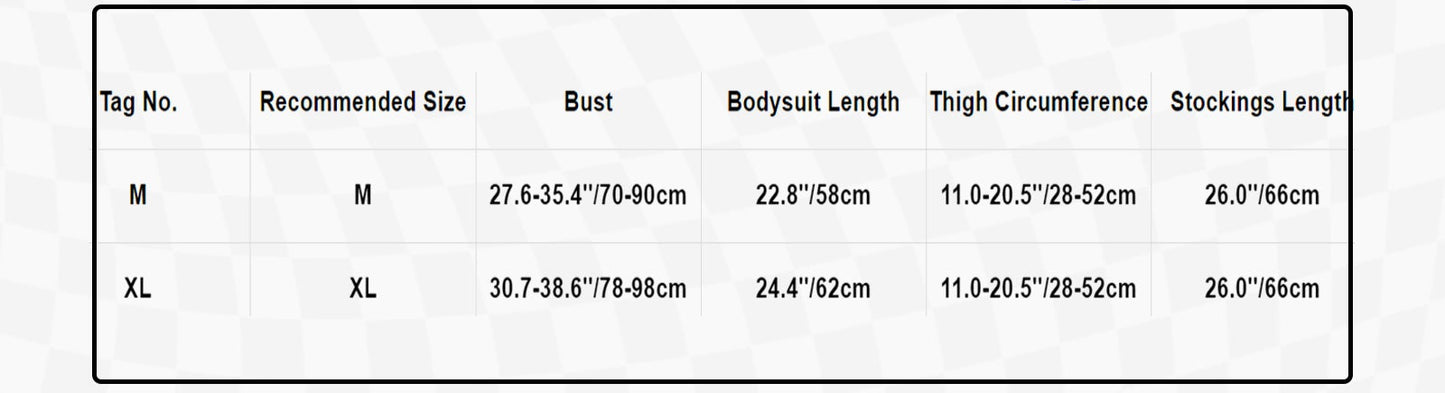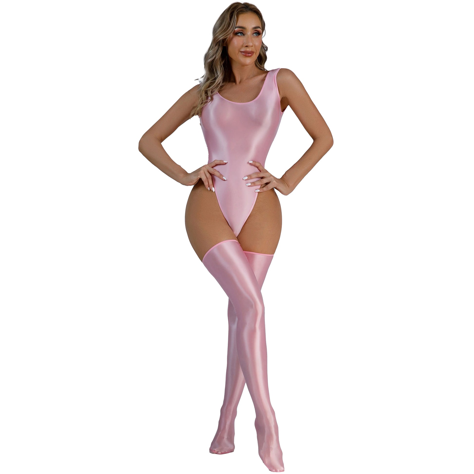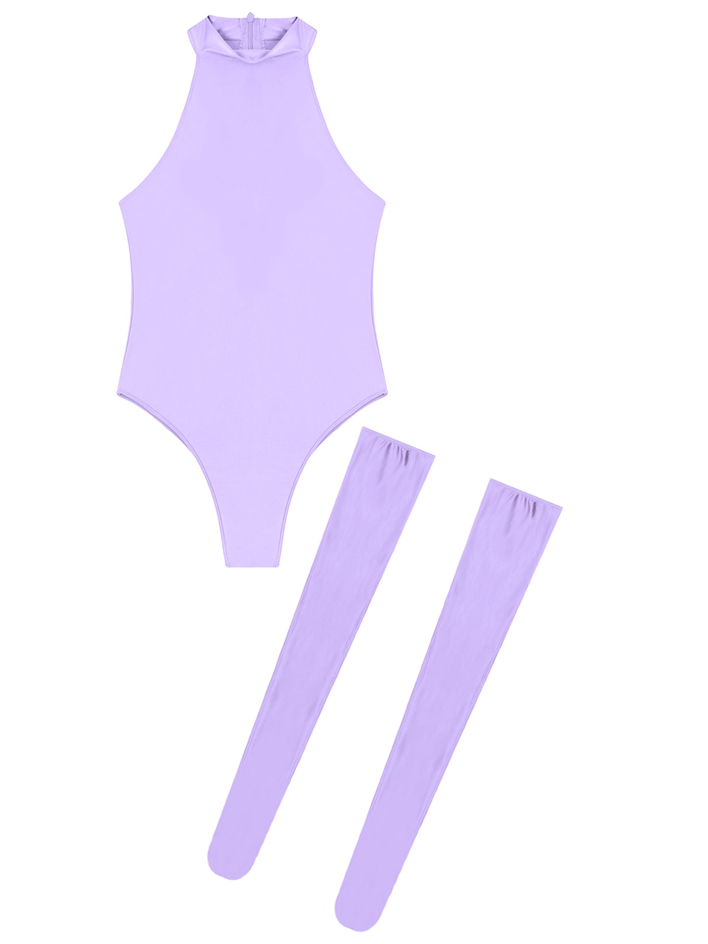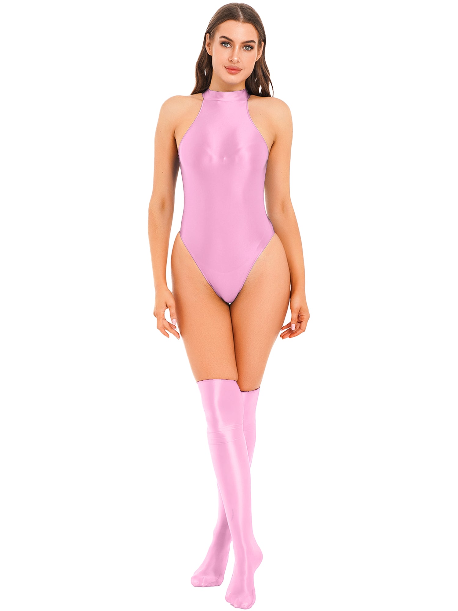 The glossy finish adds a touch of sexiness and elegance to the overall design. The mock neck and sleeveless style give it a modern and chic look, while the thigh-high stockings add a touch of playfulness.