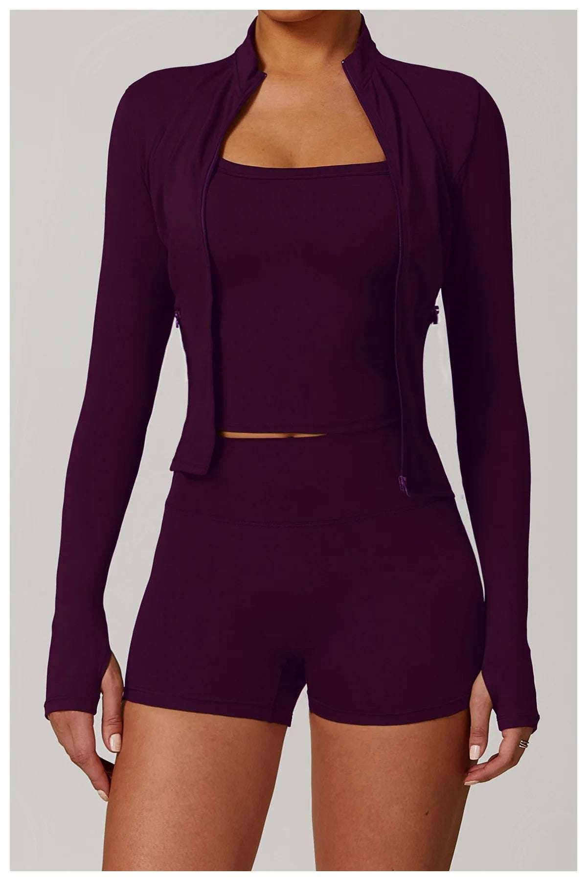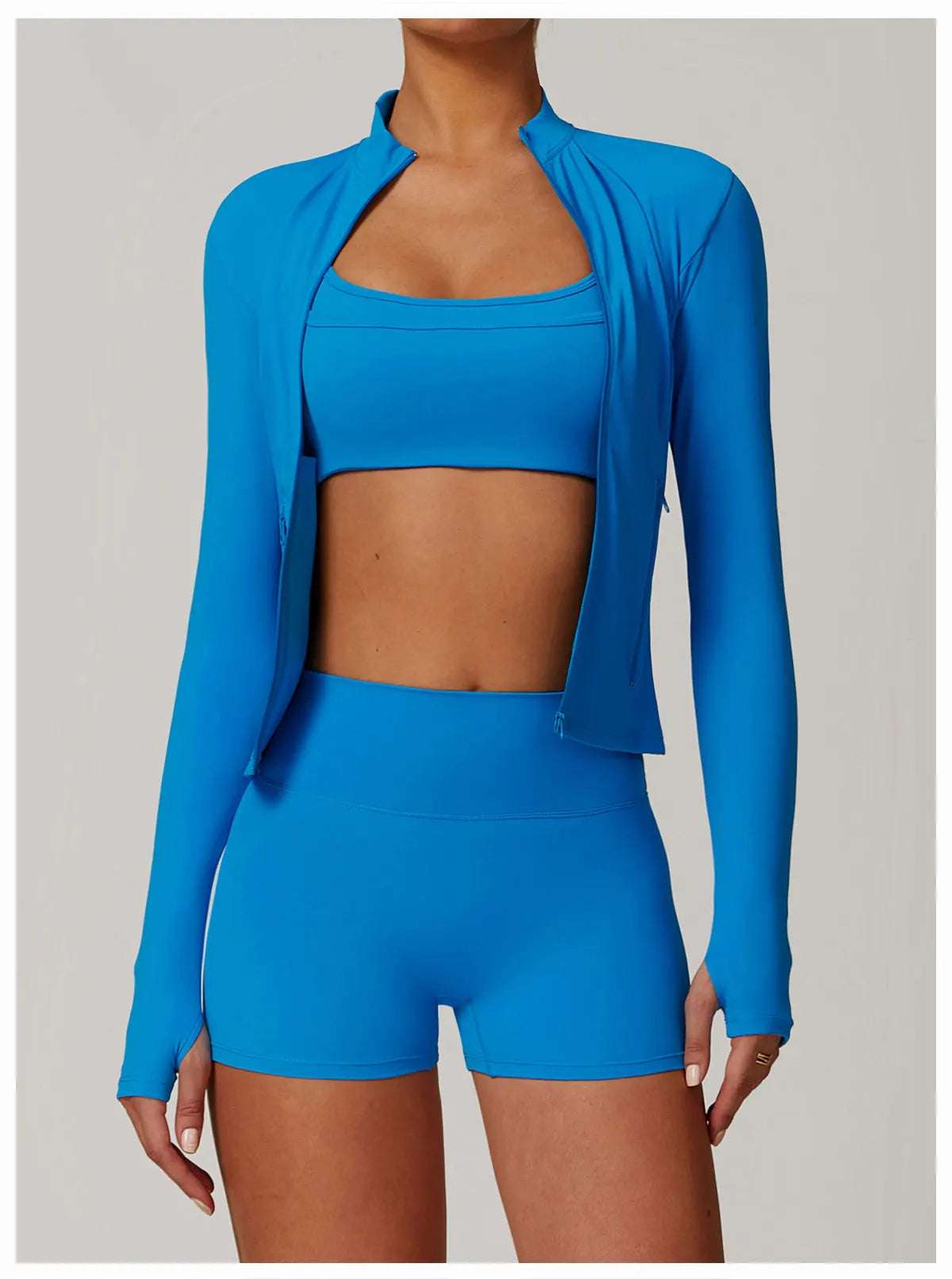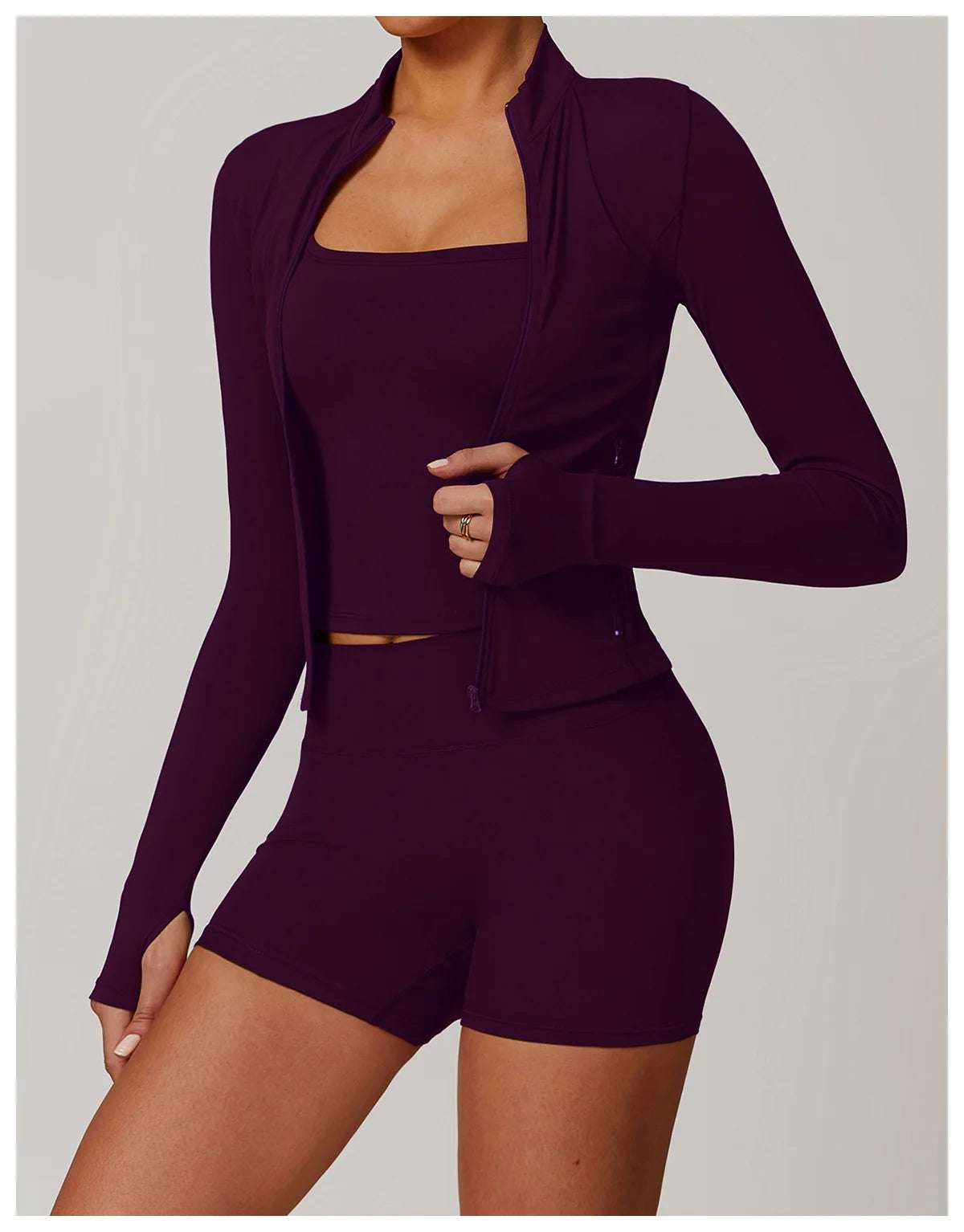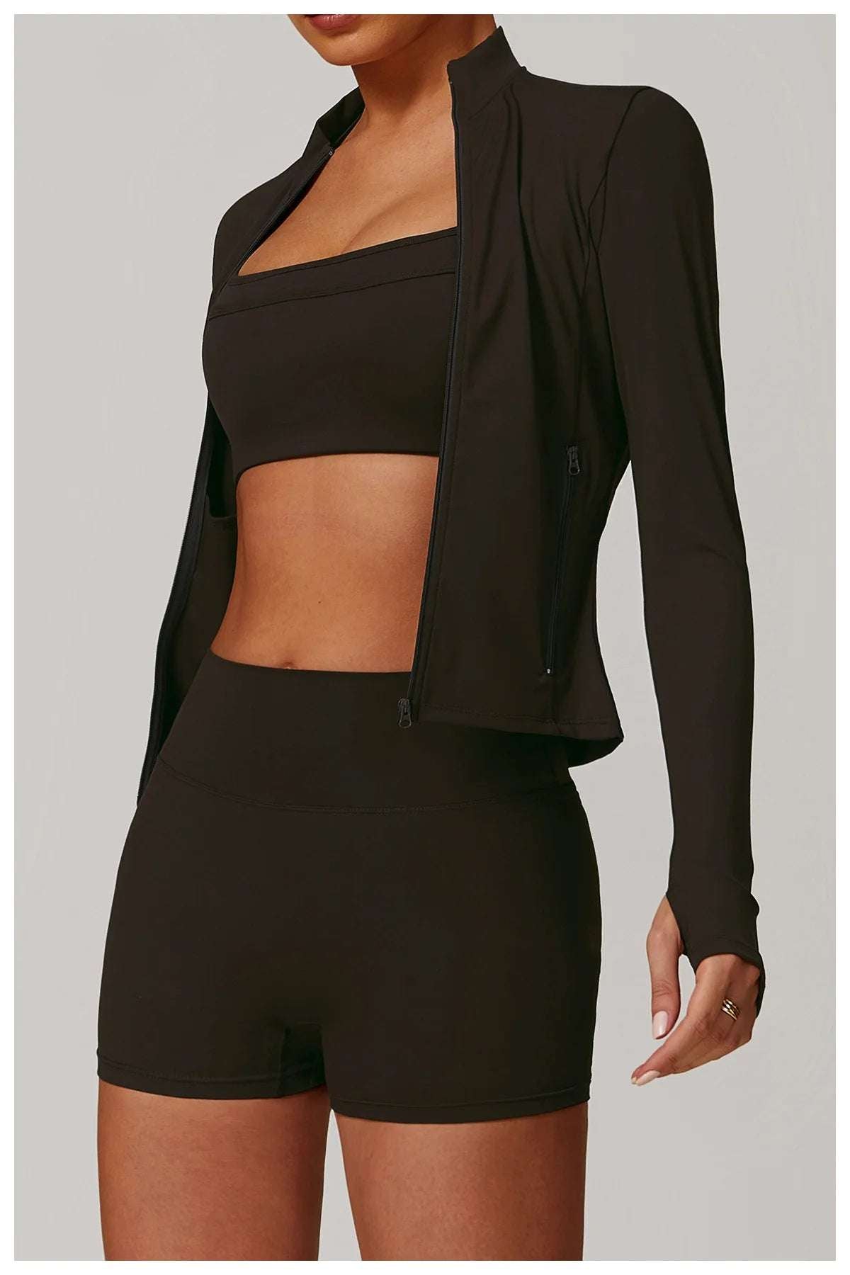 The jacket also features thumb holes, allowing you to secure the sleeves in place and prevent them from riding up during your movements. This makes it ideal for yoga, gym, or any other fitness activities. The crop top style adds a trendy touch to the jacket, making it suitable for both workout and casual wear.