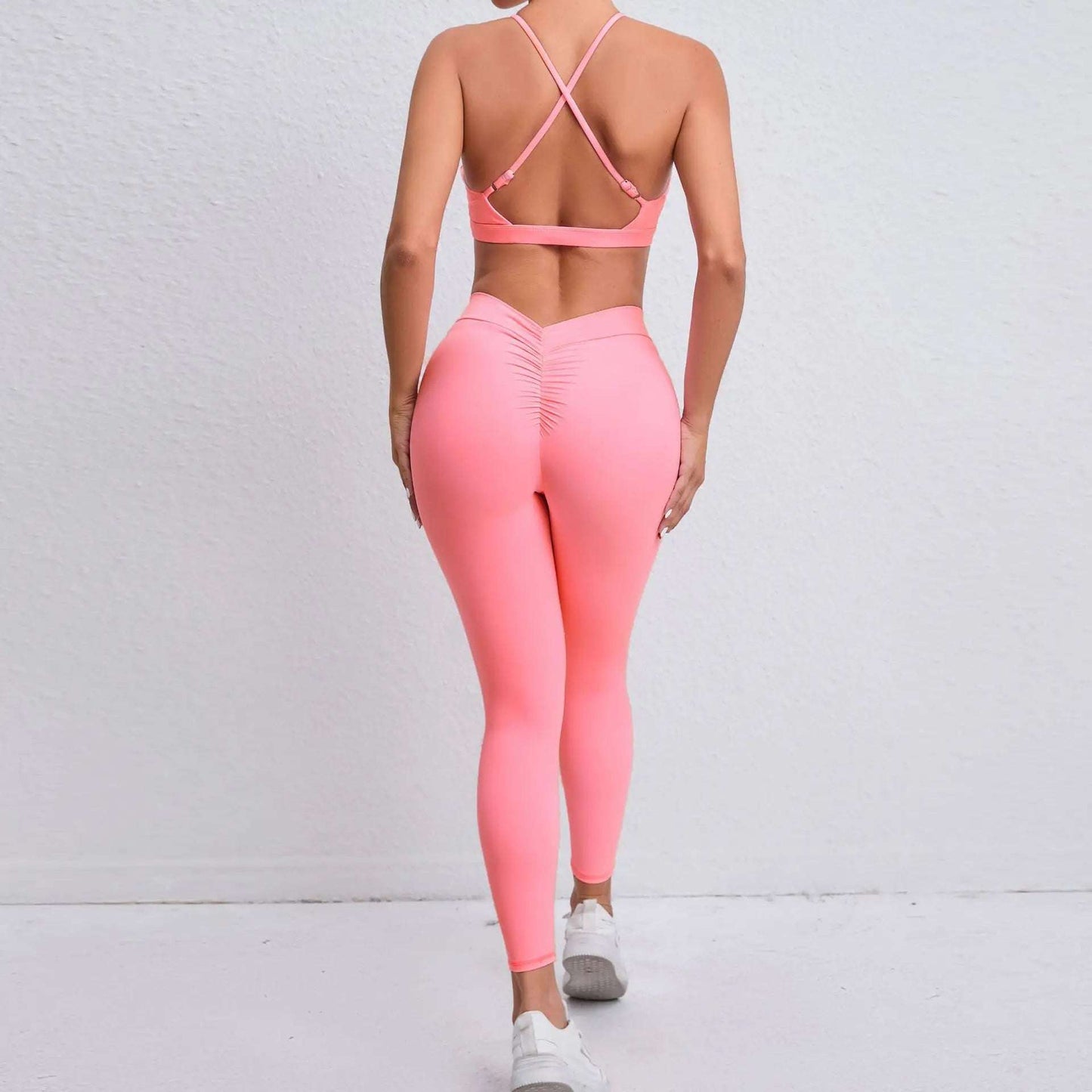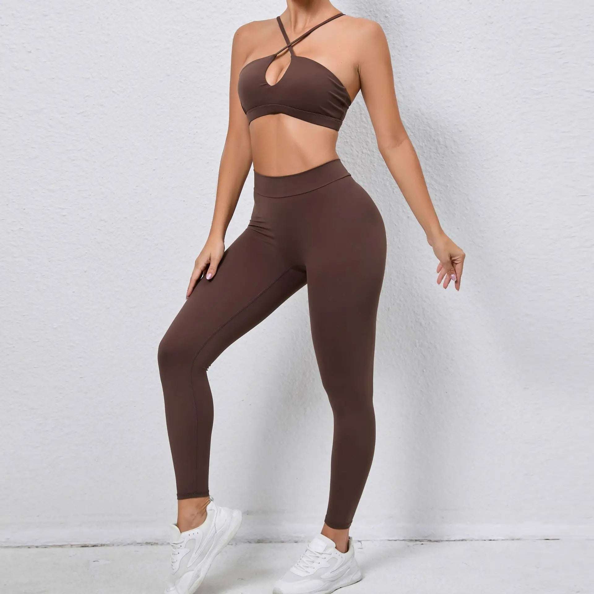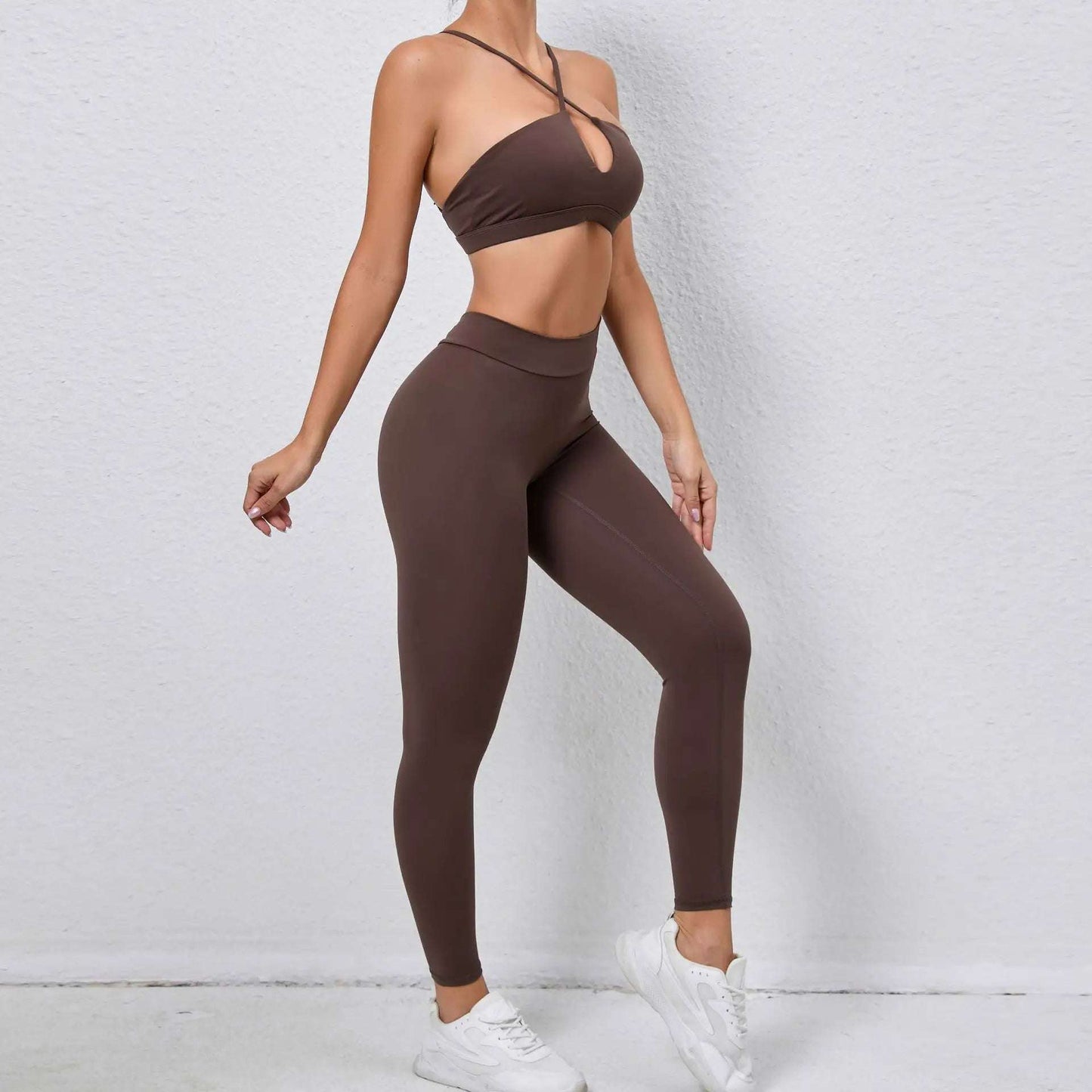 The halter neck sports bra offers a secure fit and allows for easy movement, while the high waist leggings provide a flattering silhouette and extra coverage.